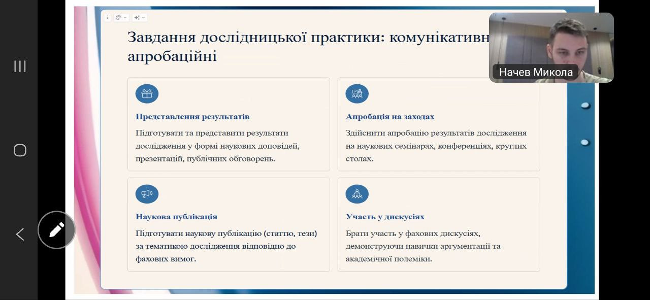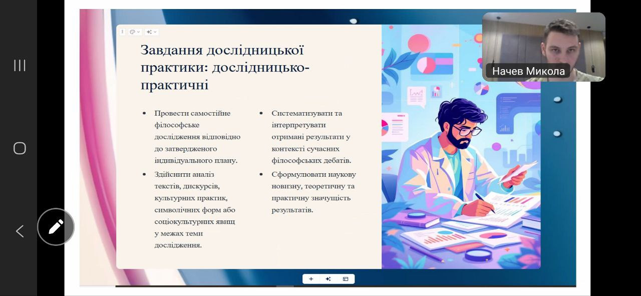 Метою дослідницької практики є набуття та поглиблення навичок самостійної науково-дослідницької діяльності, формування здатності до критичного філософського аналізу ідей, концепцій і теоретичних позицій, а також розвиток дослідницької, методологічної й академічно-комунікативної компетентностей, необхідних для майбутньої науково-педагогічної діяльності за спеціальністю «Філософія». Під час настановчої конференції було окреслено основні завдання дослідницької практики, зокрема, аналітико-теоретичні, методологічні, дослідницько-практичні, комунікативно-апробаційні, інформаційно-аналітичні та рефлексивно-узагальнювальні, ознайомлено практиканта з термінами, робочою програмою та звітною документацією. Окремо було підкреслено, що проходження дослідницької практики сприяє формуванню загальних і фахових компетентностей, в тому числі креативності, проблемного мислення, здатності працювати в міжнародному та полікультурному контексті, а також досягненню програмних результатів навчання, пов’язаних із глибоким розумінням філософських теорій, методології наукового пізнання та організації освітнього процесу у сфері філософії. Настановча конференція стала важливою платформою для узгодження індивідуальних дослідницьких траєкторій аспірантів, окреслення очікуваних результатів практики та посилення дослідницької культури в межах освітньо-наукової програми «Філософія».
