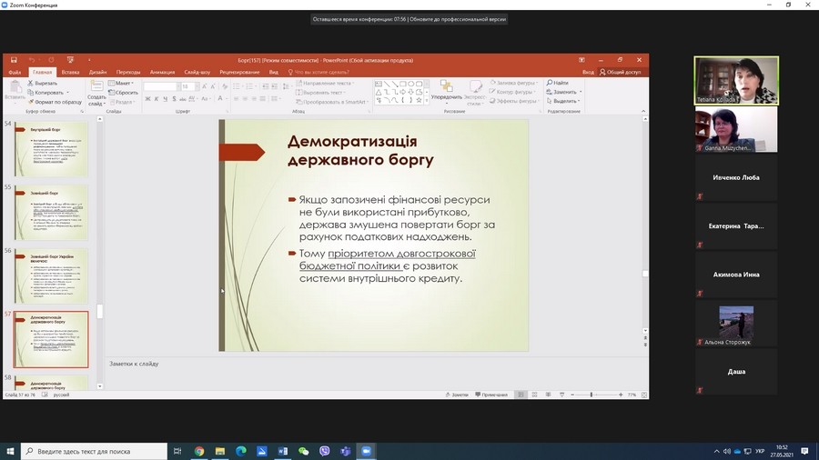 В Університеті Ушинського для аспірантів спеціальності 052 Політологія в межах елективної дисципліни «Сучасна державна політика» 27 травня 2021 року відбулася гостьова лекція кандидата економічних наук, доцента кафедри фінансів імені Л. Л. Тарангул Університету державної фіскальної служби України КОЛЯДИ Тетяни Анатоліївни на тему «Демократизація державного боргу та боргова безпека сучасних держав». Тетяна Коляда є знаним фахівцем в сфері публічних фінансів та управління боргом, яка на міждисциплінарному рівні розглядає економічні підвалини соціально-політичних процесів в сучасних державах, зокрема в країнах ЄС та в Україні, має багато цитованих публікацій за цією проблематикою в наукометричних виданнях. У межах цієї лекції експертка зосередила увагу на демократизації державного боргу та зростаючій ролі соціальних функцій сучасних держав, що спричинюють зростання боргового навантаження на національну економіку і перетворюють управління боргом на один з пріоритетів державної політики України та інших держав світу.