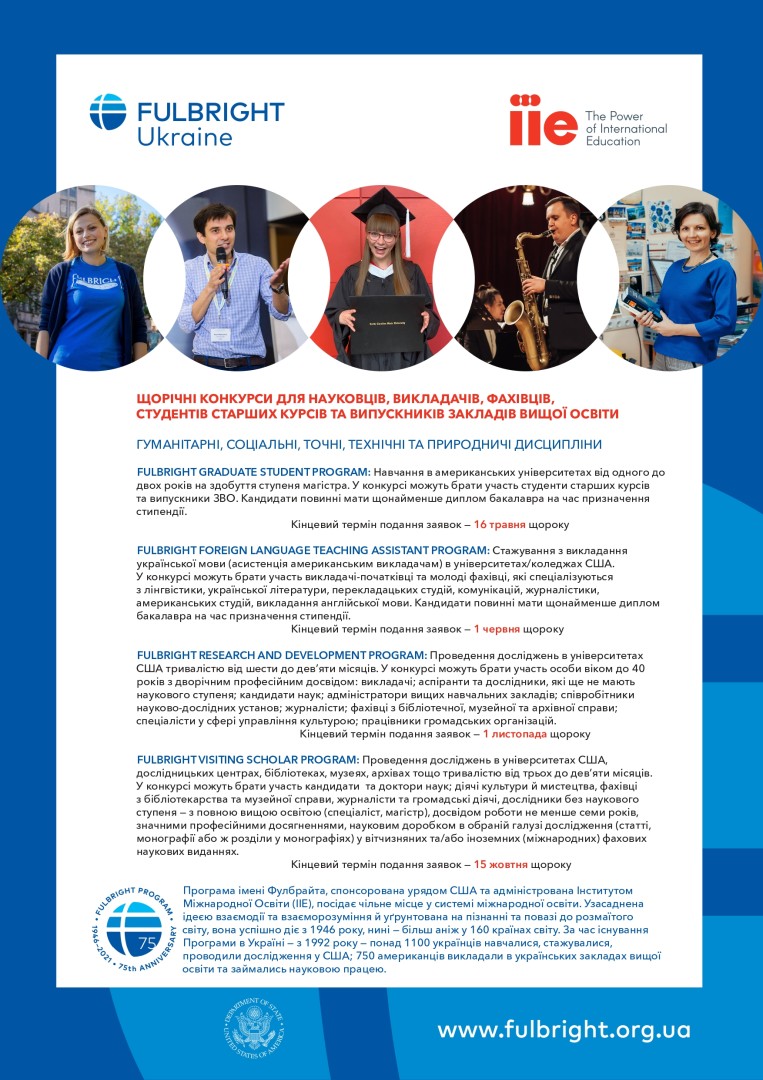 У п’ятницю, 26 лютого о 15:00 відбудеться презентація програм імені Фулбрайта на платформі Zoom Meeting. Короткий опис програм імені Фулбрайта додається в форматі pdf.