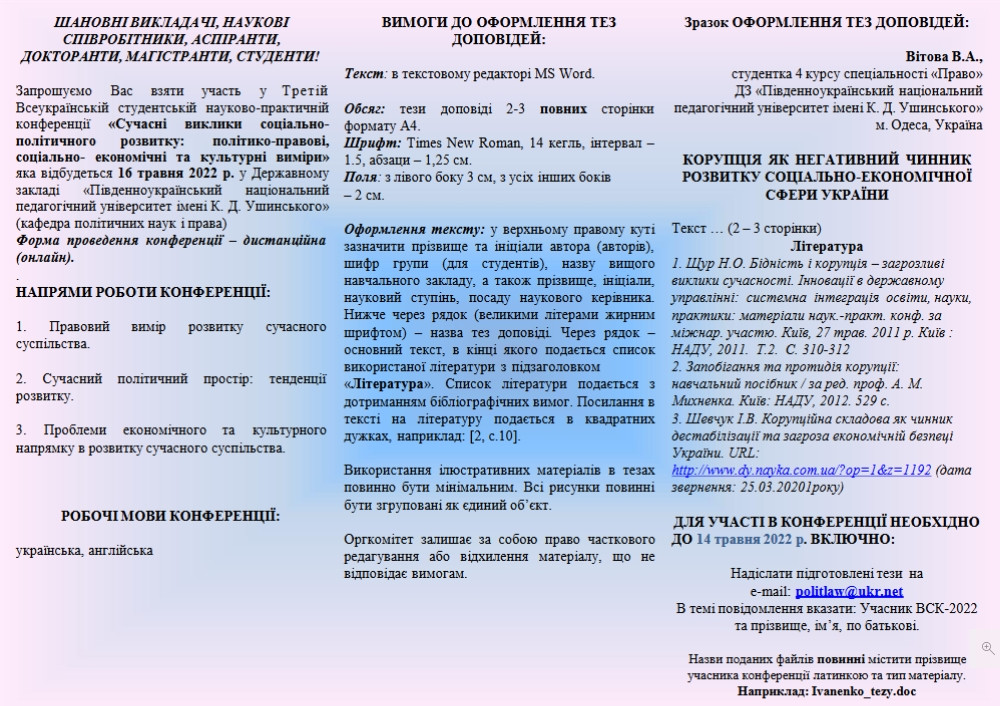 Кафедра політичних наук і права запрошує Вас взяти участь у Третій Всеукраїнській студентській науково-практичній конференція «Сучасні виклики соціально-політичного розвитку: політико-правові, соціально-економічні та культурні виміри» яка відбудеться 16 травня 2022 р. у Державному закладі «Південноукраїнський національний педагогічний університет імені К. Д. Ушинського».