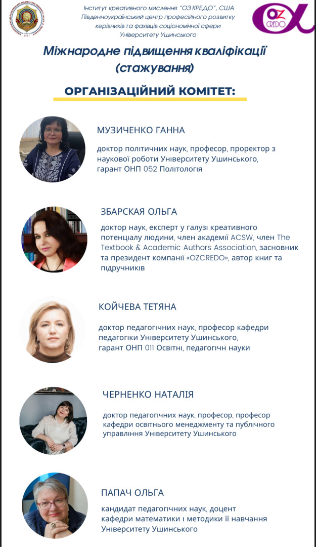 1Міжнародне підвищення кваліфікації (стажування) Інститут креативного мислення “ОЗ КРЕДО”, США Південноукраїнський центр професійного розвитку керівників та фахівців соціономічної сфери Університету Ушинського Увага! Оголошується реєстрація на стажування за програмою: “РОЗВИТОК КРЕАТИВНОСТІ ЯК РЕСУРСУ ІННОВАЦІЙНОГО ПОТЕНЦІАЛУ ОСОБИСТОСТІ : ПСИХОЛОГО-ПЕДАГОГІЧНІ АСПЕКТИ” 07 лютого – 07 квітня 2025 року Обсяг 180 год (6 кредитів ЕКТС) Кожен учасник підвищення кваліфікації отримає сертифікат виданий Інститутом креативного мислення “ОЗ КРЕДО”, США на електронну пошту. Анкета доступна за посиланням: https://forms.gle/uLkgZFg8JBXbdDZm6 Детальна інформація за телефоном: +380(98)-439-56-00 Соловейчук Олена Поспішайте, кількість місць обмежена! Будемо раді бачити вас на Міжнародному підвищенні кваліфікації (стажуванні)