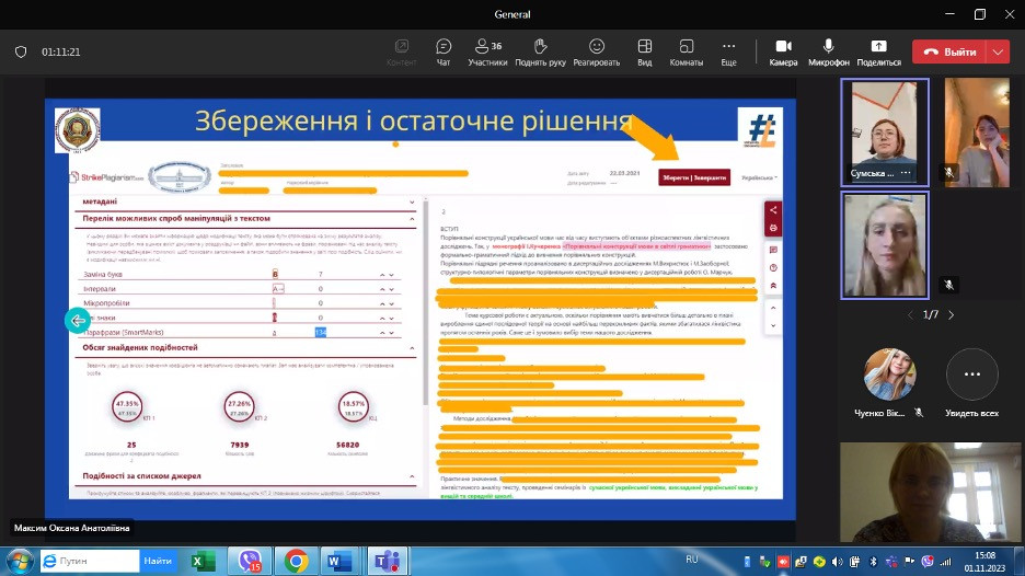 Студентам було презентовано системи для перевірки текстів на ознаки плагіату, зокрема Strike Plagiarism (Україна), особливості процедури перевірки на наявність текстових запозичень, а також зміст звіту подібності та його інтерпретацію.