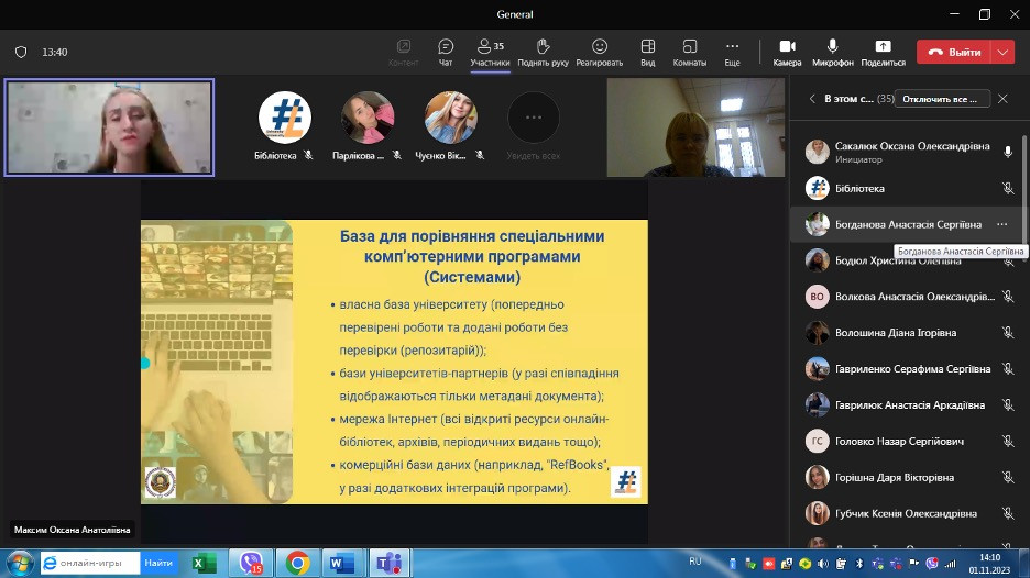 01 листопада 2023 р. о 14.00 на платформі teams (в команді «Академічна доброчесність») для студентів навчально-наукового інституту природничо-математичних наук, інформатики та менеджменту було проведено вебінар «Запобігання та протидія академічному плагіату при написанні наукових робіт». Спікером виступила в. о. директора бібліотеки Оксана Максим, організатором – завідувач кафедри освітнього менеджменту та публічного управління Оксана Сакалюк.