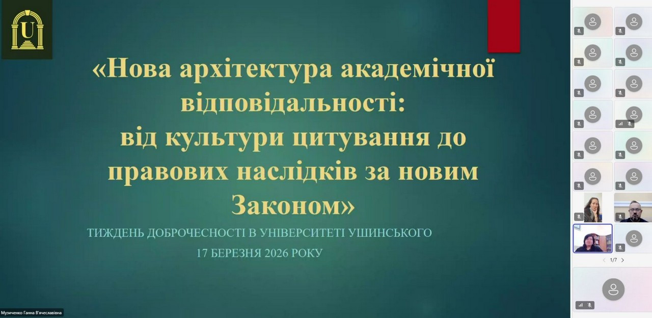 17 березня 2026 року викладачі та здобувачі освіти другого (бакалаврського) і третього (освітньо-наукового) рівнів долучилися до відкритої лекції проректора з наукової роботи університету, доктора політичних наук, професора Музиченко Г. В. на тему «Нова архітектура академічної відповідальності: від культури до правових наслідків за новим Законом». Під час лекції було розглянуто положення Закону України «Про академічну доброчесність», питання нормативного забезпечення академічної доброчесності та відповідальності за її порушення, а також особливості використання інструментів штучного інтелекту в освітній і науковій діяльності та принципи декларування їх використання.