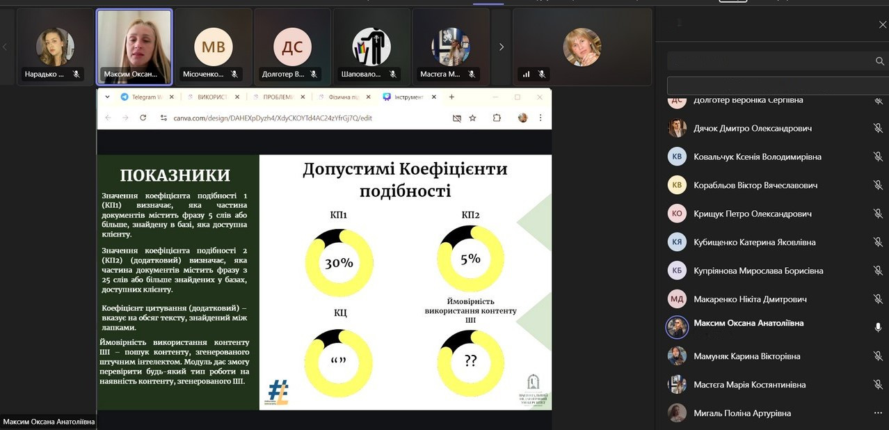 У межах Тижня академічної доброчесності також проведено зустріч-бесіду зі здобувачами освіти першого курсу спеціальностей А4 Середня освіта (Математика), А4 Середня освіта (Фізика та астрономія), А4 Середня освіта (Інформатика) та А4 Середня освіта (Природничі науки), організовану викладачем-стажистом кафедри інноваційних технологій та методики навчання природничих дисциплін Соловейчук О. М. Під час заходу розглянуто питання використання інструментів штучного інтелекту в навчальному процесі, дотримання принципів академічної доброчесності, запобігання плагіату, формування академічної відповідальності та розвитку критичного мислення здобувачів освіти.