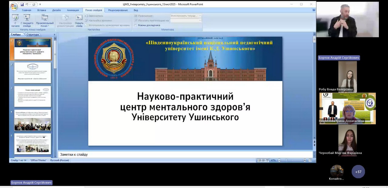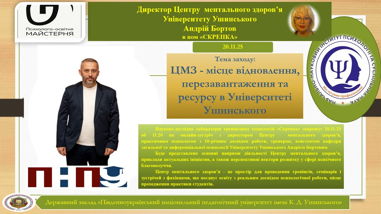 On November 20, the scientific research laboratory of training technologies "Skrepka", created on the basis of the Department of Theory and Methods of Practical Psychology of the Educational and Scientific Institute of Psychology and Social Sciences of Ushynsky University, was visited for an online meeting by Andriy Serghiovych Bortov, the Director of the Mental Health Center, a practical psychologist with 10 years of work experience, trainer, assistant professor of the Department of General and Differential Psychology of Ushynsky University.