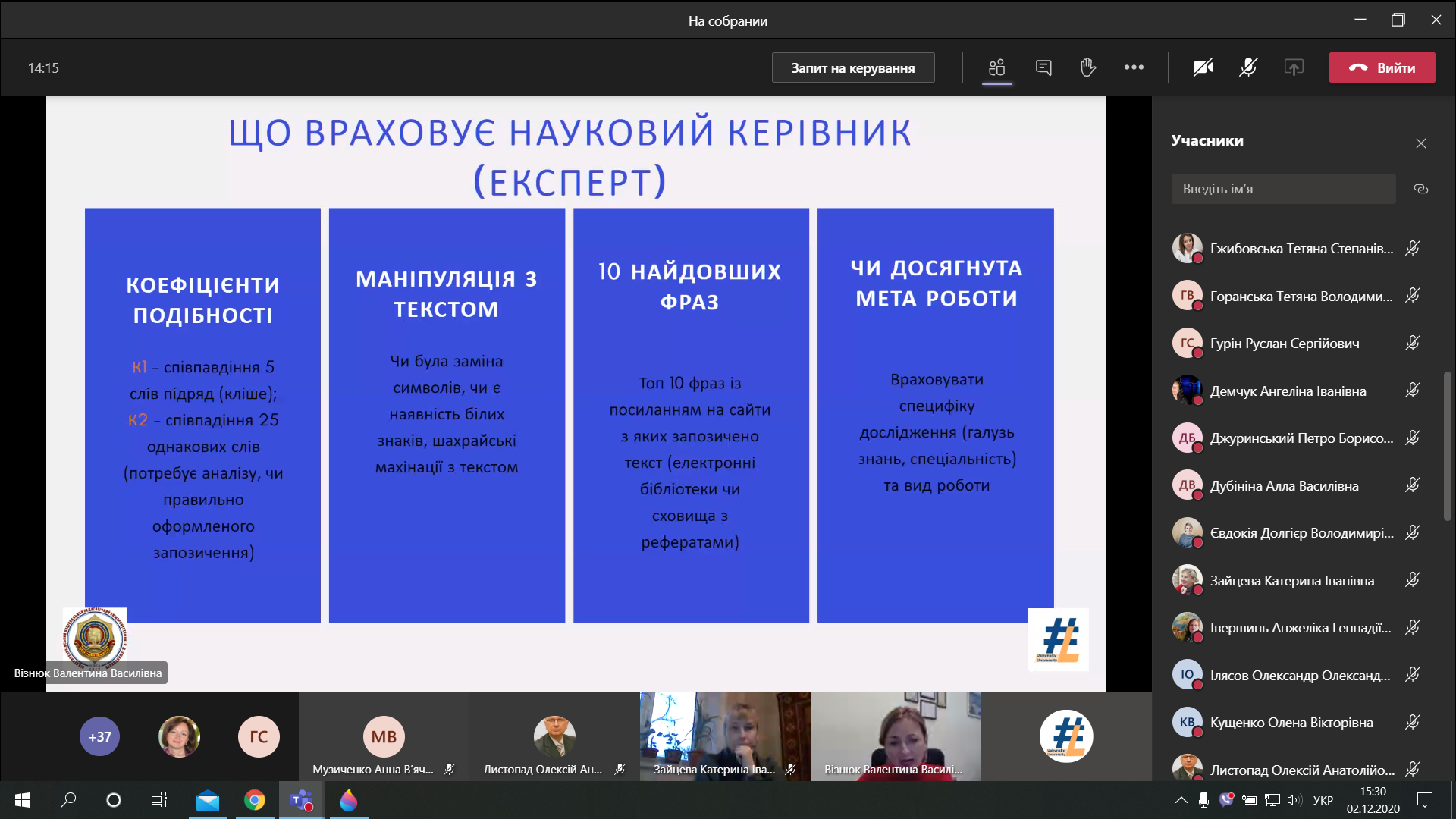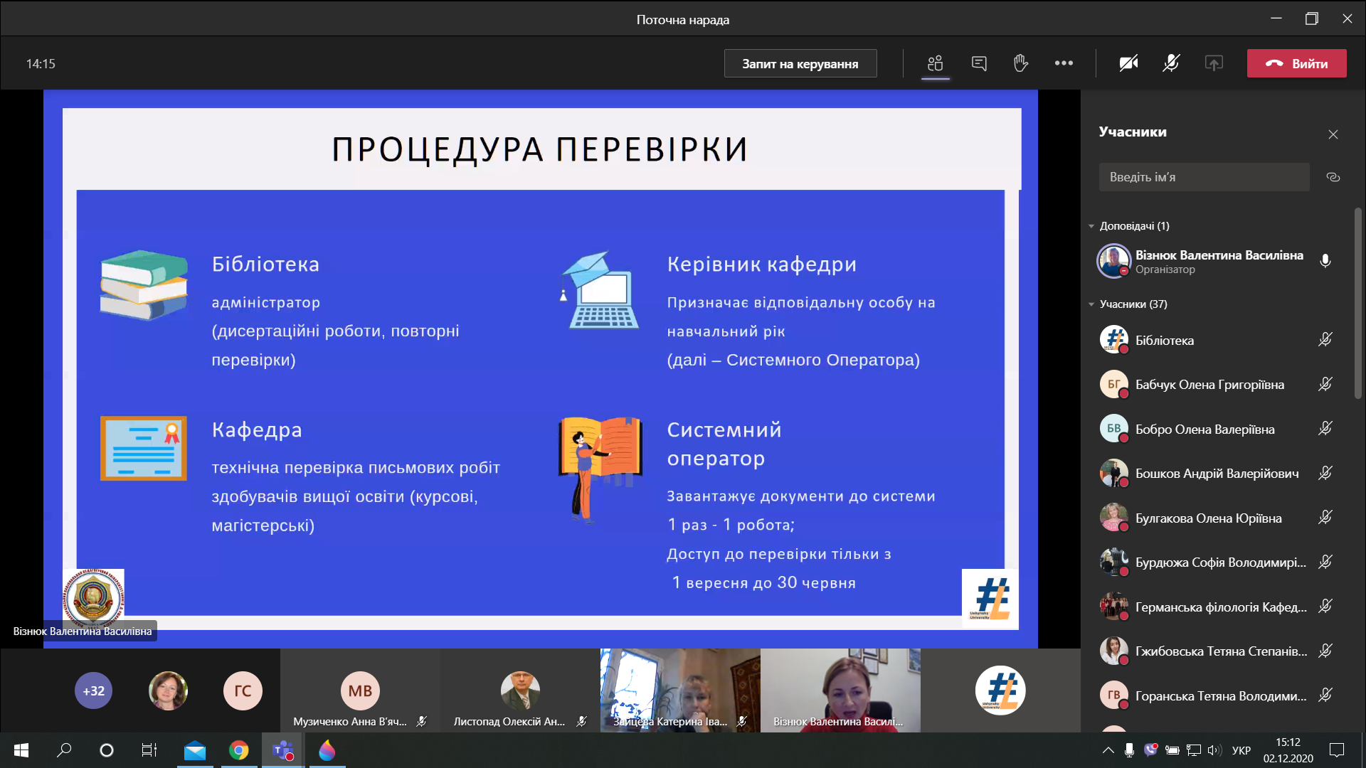 On December 2, 2020, on the eve of the winter session and the defense of master's theses, the library of Ushynsky University held an online workshop on technical verification of textual borrowings in students' written works for system operators and supervisors. The participants were introduced to the mechanisms and indicators of the Strikeplagiarism system and the procedure for checking written works at Ushynsky University. The speaker of the webinar, the director of the library, the candidate of pedagogical sciences Valentyna Vizniuk invited the participants to consider the cases on the issues of technical inspection.