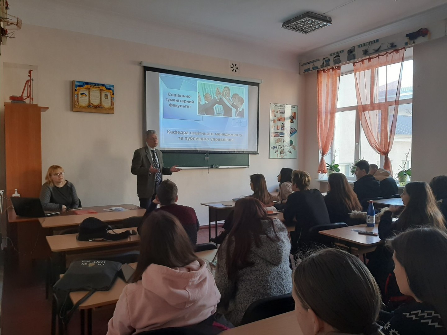 On February 22, 2021, the teachers of the Department of Educational Management and Public Administration of South Ukrainian National Pedagogical University named after K.D. Ushynsky presented specialty 281 Public Administration and Administration to students of Odesa Automobile and Road College. The head of the department O.O. Dolzhenkov acquainted future entrants with the features of the educational and professional program "Public Administration" and the prospects for further management careers for its graduates. Associate Professor O.O. Sakalyuk spoke about the main conditions of admission to Ushynsky University in the specialty "Public Administration".