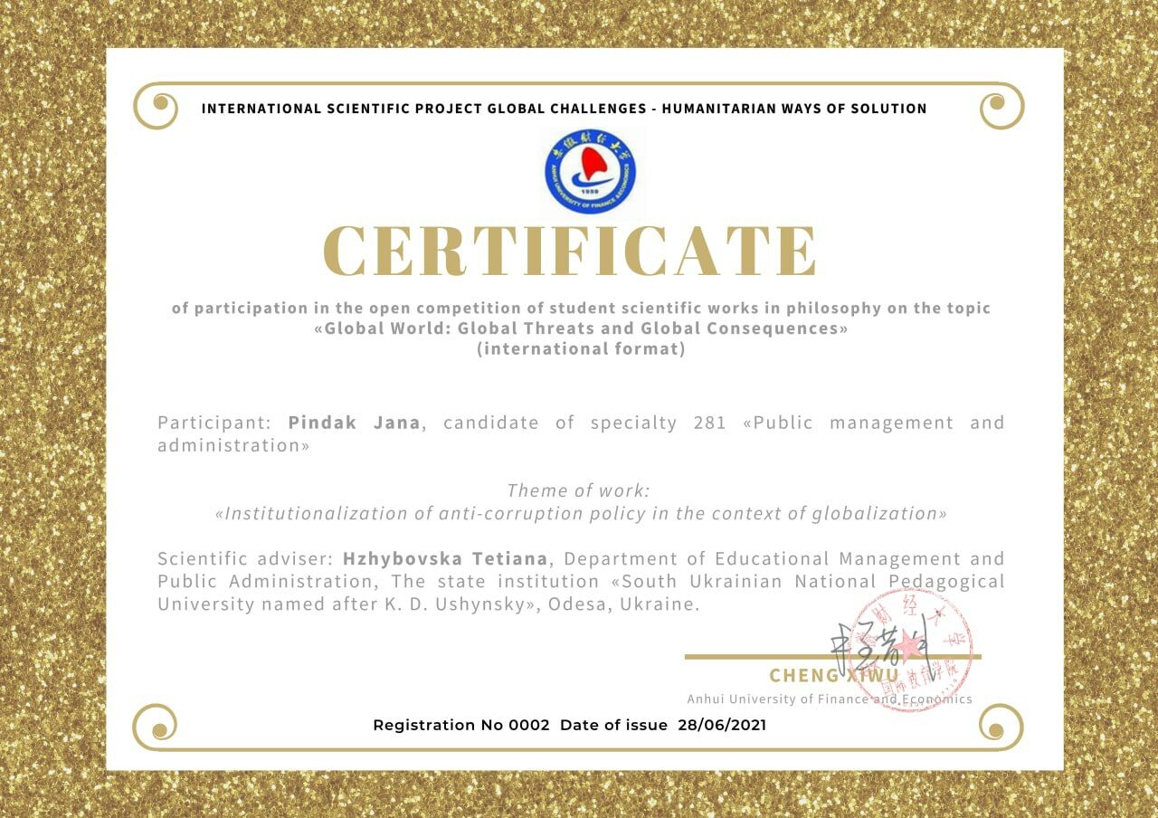 Students majoring in 281 "Public Administration" Ya. Pyndak and A. Storozhuk took part in the international scientific-methodical round table "World self-isolation as an opportunity to rethink" (08.06.2021). The students made reports "Some aspects of public administration in the context of globalization" (A. Storozhuk), "Institutionalization of anti-corruption policy in the context of globalization" (J. Pindak). According to the results, the participants were awarded diplomas.