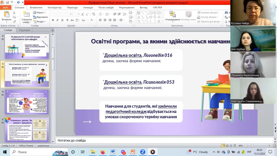 Задля підвищення професійної орієнтації 13 грудня 2023 р. відбулася онлайн зустріч із випускниками ВСП «Дубенський педагогічний фаховий коледж РДГУ». Онлайн-профорієнтаційна зустріч для здобувачів четвертого року навчання спеціальності 012 «Дошкільна освіта» проведена завідувачкою кафедри теорії та методики дошкільної освіти д.п.н., проф. Людмилою Березовською та д.п.н., доц. Русланою Найдою.