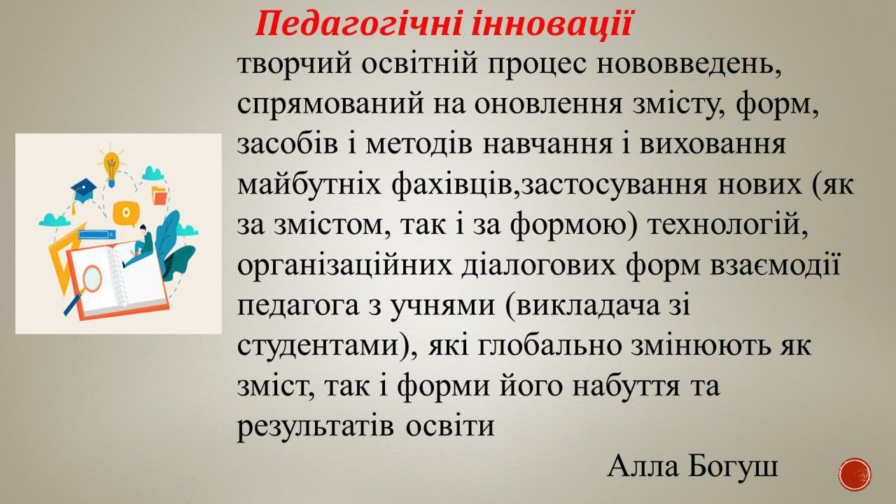 У процесі розповіді І. Сараєва схарактеризувала складники готовності педагога до інноваційної діяльності, наголосила, що в умовах сучасної освіти інноваційна діяльність є не лише необхідністю, а й ключовим показником професійної компетентності педагога.