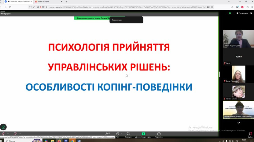 4 листопада 2025 р., на факультеті дошкільної педагогіки та психології, відповідно до чинної ОПП «Дошкільна освіта. Управління закладом дошкільної освіти», відбулася гостьова лекція С.К. Хаджирадєвої, доктора наук з державного управління, професора, магістра психології, проректора з навчальної роботи державного університету інтелектуальних технологій і зв’язку (м. Одеса). Магістранти долучилися до обговорення проблем психології прийняття управлінських рішень. Лектор внесла новизну і протиріччя в навчальний зміст, що вирішувалися в ході лекції, дискутуючи зі здобувачами освіти щодо специфіки технологій пошуку індивідуальних і колективних рішень; складності, невизначеності та ризиків прийняття управлінських рішень, якості та ефективності прийнятих управлінських рішень [Query]. В ході лекції, магістранти зрозуміли, що обговорення складності, невизначеності та ризиків прийняття управлінських рішень [Query] є моделюванням сучасного VUCA-середовища (Volatility, Uncertainty, Complexity, Ambiguity), в якому доводиться працювати керівникам закладів освіти. Магістранти усвідомили важливість не лише знань основних функцій управління, але й здатності аналізувати дані для прийняття управлінських рішень, враховуючи при цьому цілі, ресурси та ризики.