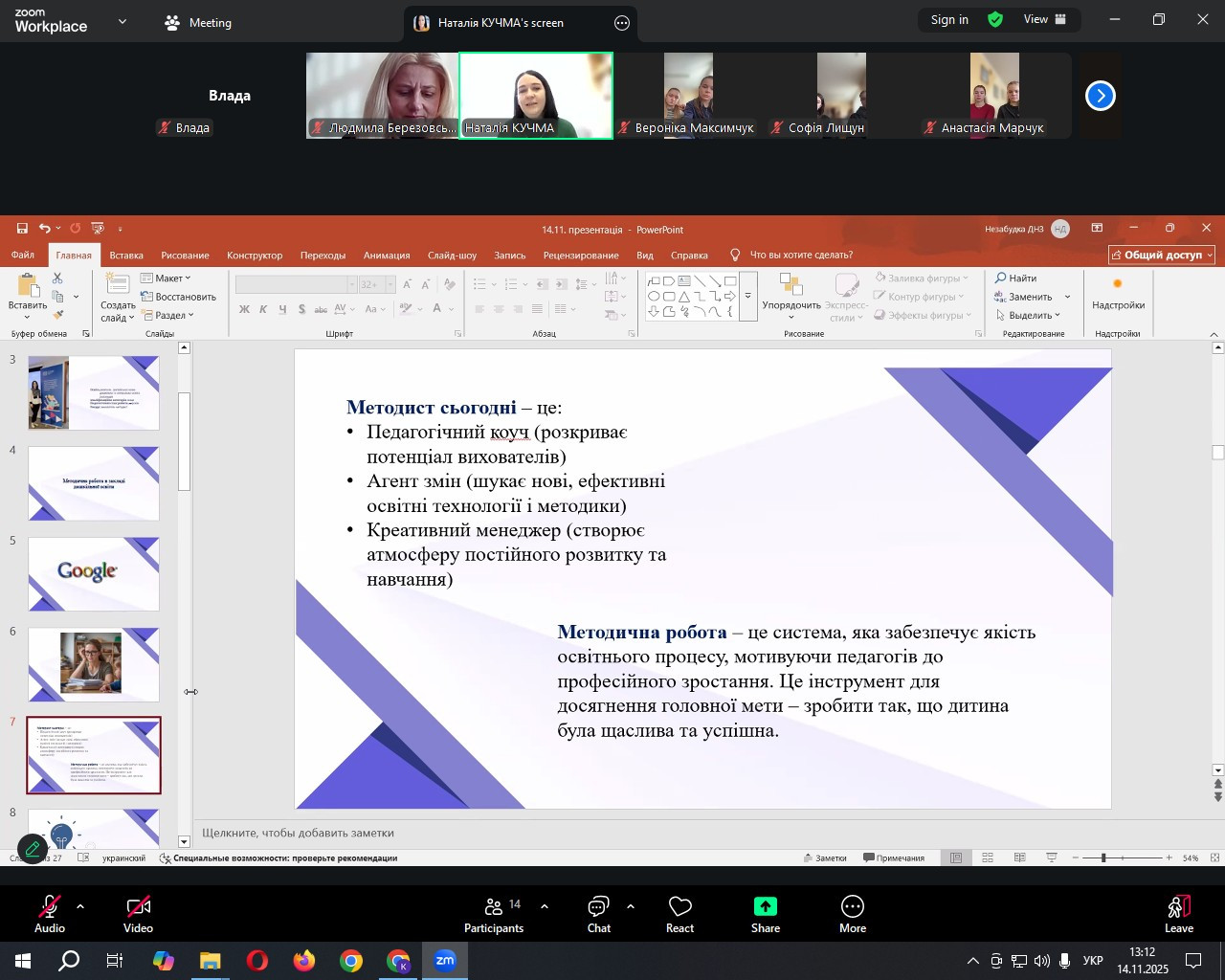 Тема лекції – «Методика організації методичної роботи в закладі дошкільної освіти» – передбачала висвітлення ключових аспектів професійної діяльності вихователя-методиста. Наталія Анатоліївна детально розкрила роль методиста як координаторки освітнього процесу та організаторки професійного розвитку педагогічного колективу, підкреслила важливість системного підходу до планування, моніторингу та оцінювання методичної роботи, навела приклади використання компетентнісного підходу в умовах сучасного освітнього простору.