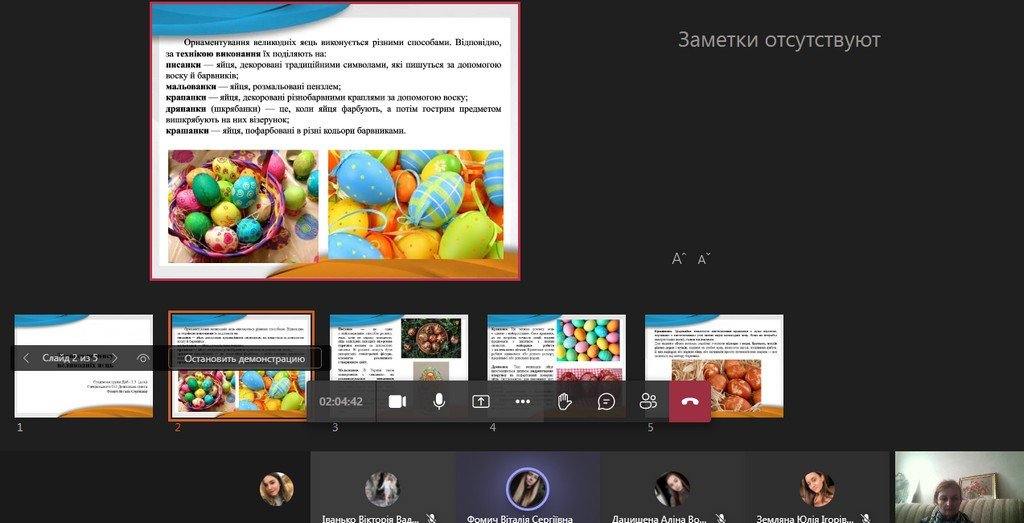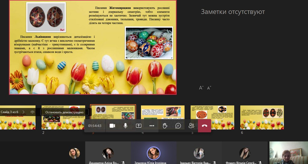На захід було запрошено народних майстринь Оксану Буймістр та Наталію Суруджій. Майстрині розповіли студентам про традиції підготування до Великодніх свят у різних куточках України. Студентки-гуртківці ознайомилися із різними техніками розписування яєць, у тому числі із сучасною технікою декупажу, стилістичними особливості орнаментів притаманних для різних регіонів України та розмалювали свої писанки та крашанки.