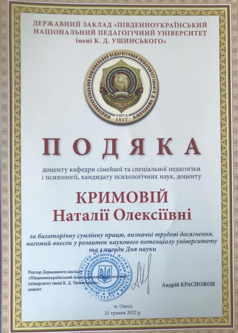 За багаторічну сумлінну працю, визначені трудові досягнення, вагомий внесок у розвиток наукового потенціалу університету та з нагоди Дня науки було нагороджено викладачів нашої кафедри, а саме: завідувача кафедри, кандидата психологічних наук, доцента Бабчук Олену Григоріївну та кандидата психологічних наук, доцента Кримову Наталію Олексіївну.