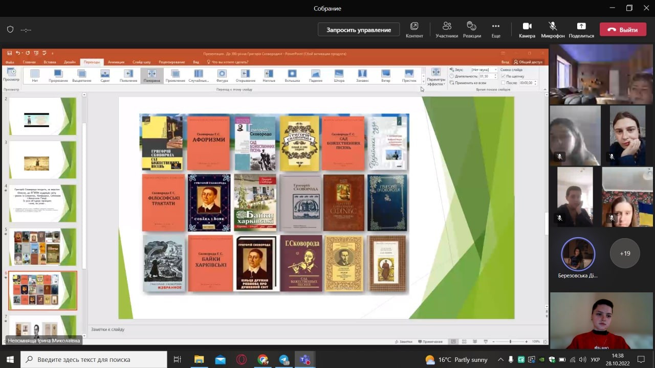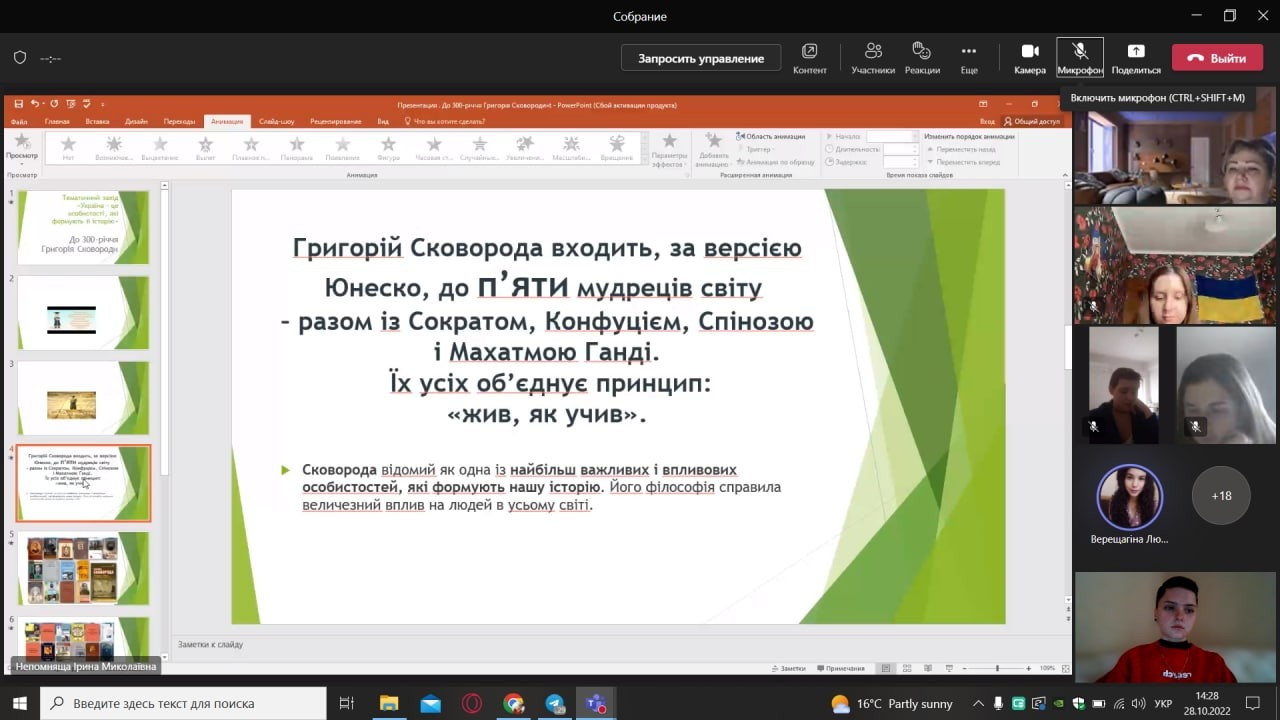 Студенти 2, 3, 4 курсу та магістри взяли активну участь у підготовці та проведенні заходу: ознайомилися з презентацією, переглянули відеоматеріали, с задоволенням декламували найвідоміші вірші, цитували афоризми Григорія Савича. Висловлюємо подяку кураторам — Бабчук Олені Григорівні, Кудрявцевій Олені Альбертівні, Мардаровій Ірині Костянтинівні, Непомнящій Ірині Миколаївні та декану факультету Булгаковій Олені Юріївні за сприяння в організації та проведенні онлайн-заходу на високому рівні.