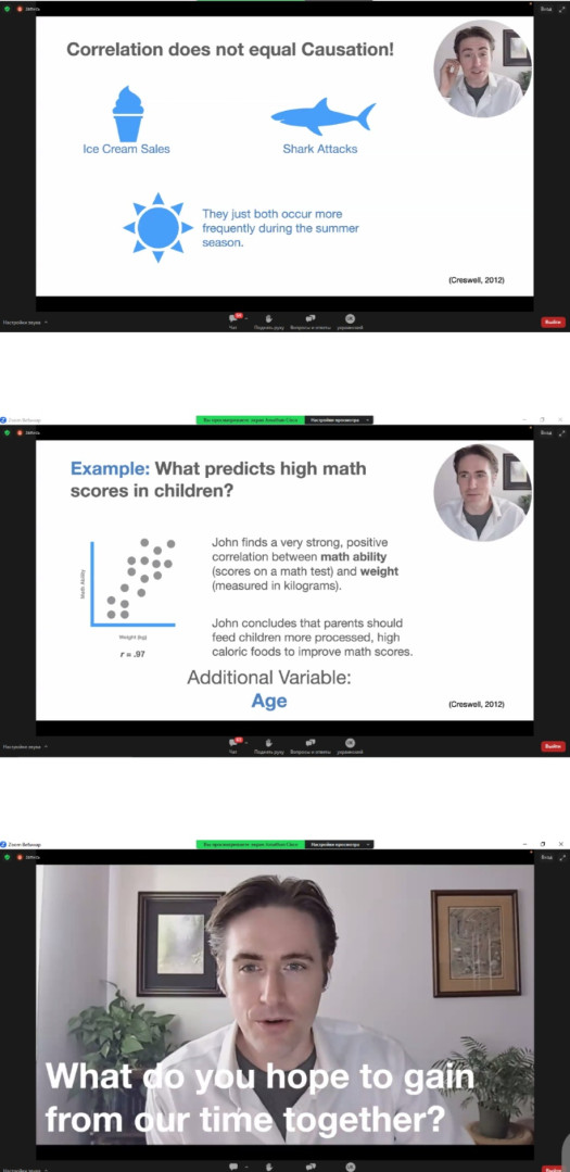 4 серпня 2023 року здобувачі третього (освітньо-наукового) рівня вищої освіти та гарант ОНП «Філософія» долучилися до онлайн лекції директора з питань освіти в Coursetune, старшого наукового співробітника Академії вищої освіти, засновника The Grad Academy Jonathan Cisco – «An Introduction to the Use of Quantitative Methods in Research in the United States».