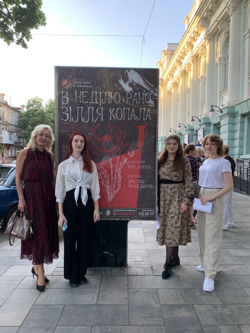 23 вересня 2023 року здобувачі першого (бакалаврського) рівня вищої освіти ОПП «Менеджмент соціокультурної діяльності» Вікторія Фіник, Поліна Самойлова, Марина Стойкова разом з куратором, Гарантом ОПП проф. Оленою Лісеєнко відвідали прем’єру вистави «В неділю рано зілля копала» (за твором Ольги Кобилянської), що проходила в Одеському академічному українському музично-драматичному театрі імені В. Василька. Вражаюча постановка пробирала до глибини душі з перших хвилин початку вистави. Захопила талановита гра акторів, прекрасна музика, колоритні танці. Емоції та враження від вистави переповнювали студентів, вони отримали величезне естетичне задоволення.