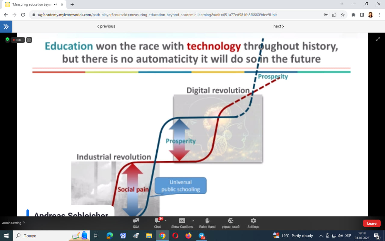 13 жовтня 2023 року науково-педагогічні працівники кафедри філософії, соціології та МСКД і здобувачі третього (освітньо-наукового) рівня вищої освіти ОНП «Філософія» доєдналися до онлайн-лекції «Measuring education beyond academic learning».Спікер – директор з питань освіти та компетенцій Організації економічного співробітництва та розвитку (ОЕСР), почесний професор Гейдельберзького університету Andreas Schleicher. Організатор заходу – Ukraine Global Faculty (UGF). Говорили про сучасні глобальні тенденції в освіті, про необхідність зміни освітньої парадигми, перегляду програми навчання, цифрові навички, формування компетенцій, які знадобляться в житті та на практиці. Дискутували про роль гуманітарних та технічних дисциплін, моделювали перспективи розвитку освіти майбутнього. Питання, що підіймалися, є надзвичайно актуальними в умовах глобальних трансформаційних процесів при підготовці викладачів ЗВО.