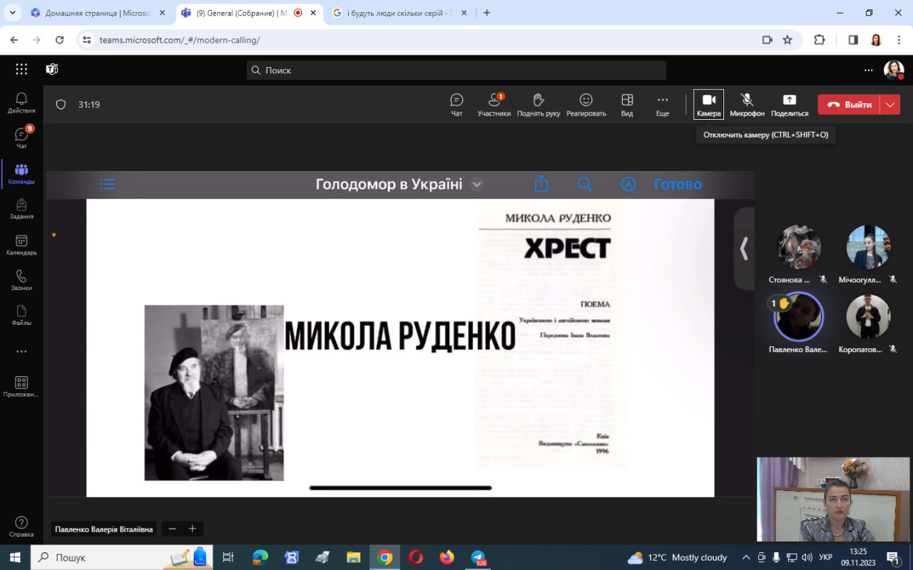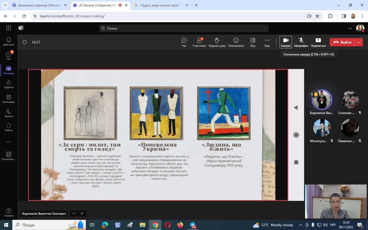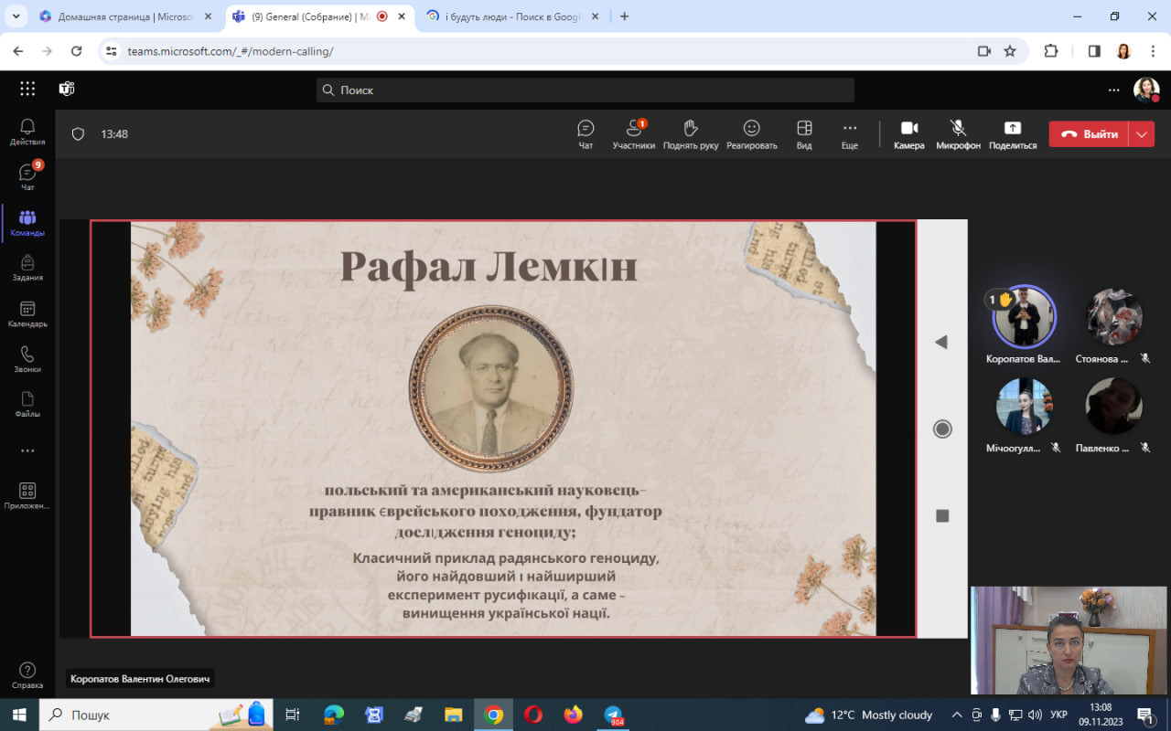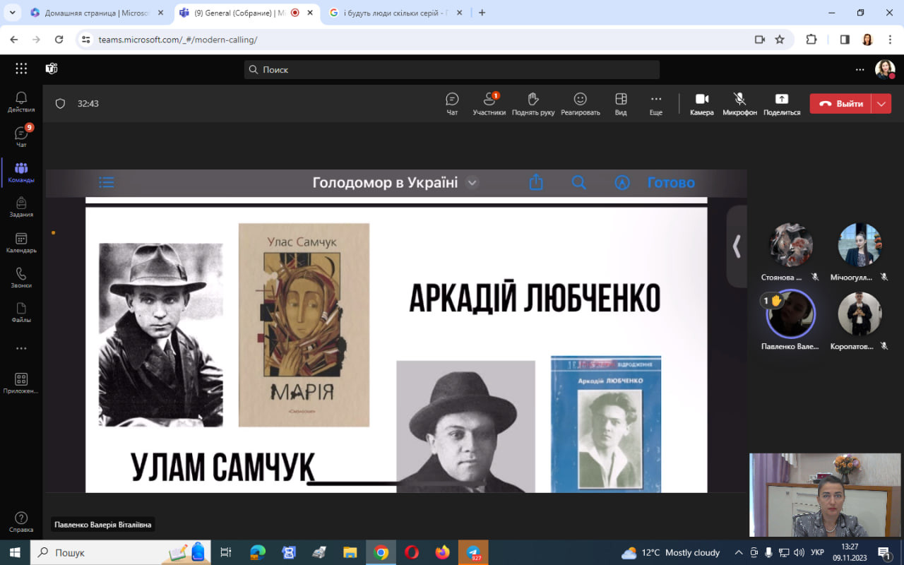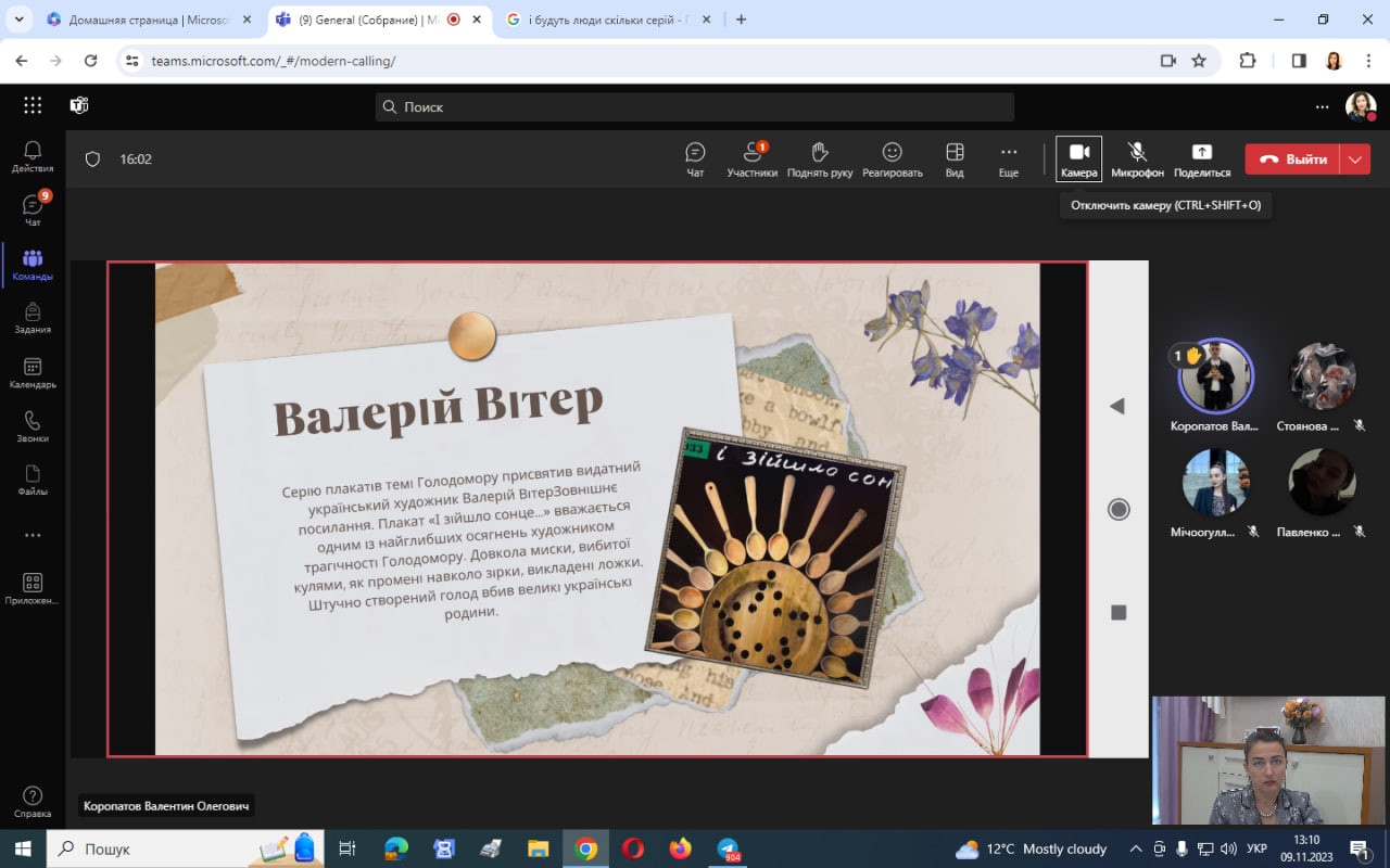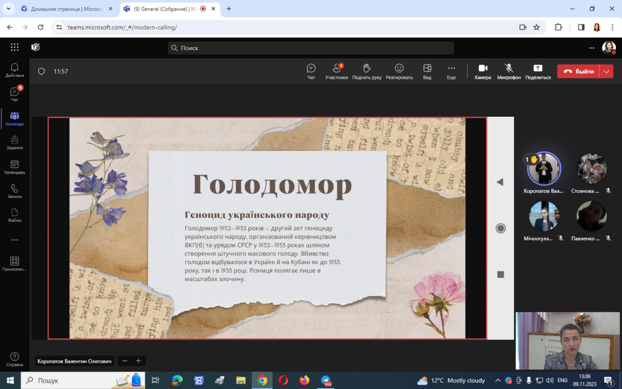 09 листопада 2023 року здобувачі першого (бакалаврського) рівня вищої освіти ОПП «Переклад», члени студентського наукового гуртка «Південноукраїнські наукові студії» (керівник – проф. Петінова О. Б.) провели зустріч, приурочену вшануванню пам’яті жертв голодомору. Студенти – Валентин Коропатов, Міліса Мічоогуллари, Валерія Павленко, Дар’я Стоянова та Чжан Чи підготували повідомлення про історичні факти цього страшного геноциду, а також розглянули та проаналізували твори мистецтва й художньої літератури, в яких відображена ця трагічна сторінка історії нашого народу. Надзвичайна біль… Пам’ятаємо… Сумуємо… Шануємо...