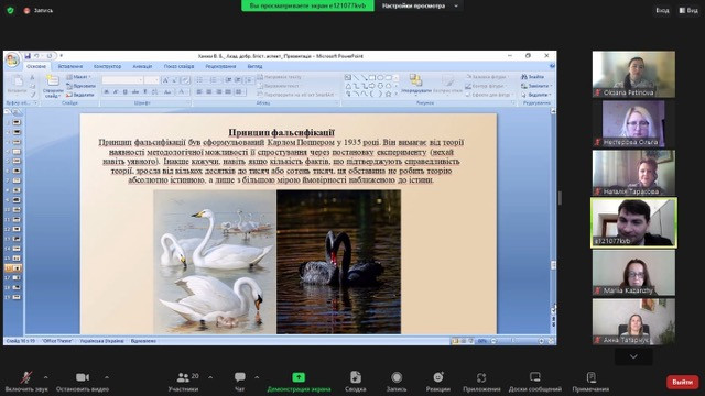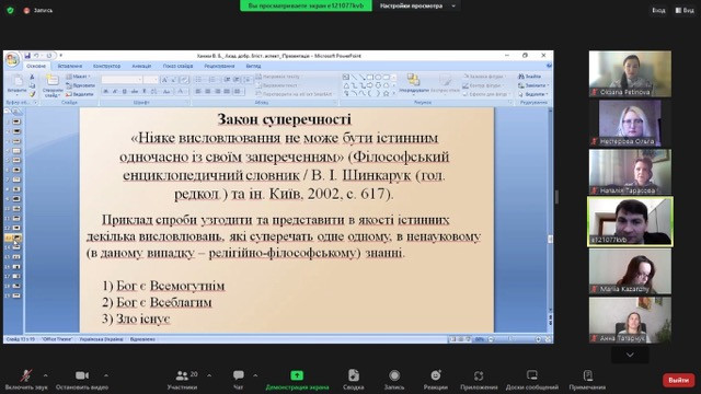 29 березня 2024 року продуктивна дискусія у дискурсі філософії об’єднала студентів, аспірантів різних спеціальностей, викладачів Університету Ушинського та ЗВО-партнерів, зокрема НТУ «Дніпровська політехніка», НУ «Чернігівська політехніка» навколо актуальних питань академічної доброчесності. Спікер – доктор філософських наук, професор, завідувач кафедри філософії, біоетики та іноземних мов Одеського національного медичного університету Володимир Ханжи – презентував тему «Академічна доброчесність: епістемологічний аспект». Гостьова лекція на запрошення Гаранта ОНП «Філософія» проф. Оксани Петінової відбулася в межах проведення Тижня академічної доброчесності Університету Ушинського. Епістемологія як філософсько-методологічна дисципліна досліджує знання як таке, його будову, структуру, функціонування і розвиток. Механізми об'єктивації та реалізації знання в науково-теоретичній і практичній діяльності з точки зору академічної доброчесності предметом дискусії сьогоднішньої зустрічі. Яка ж роль в цьому процесі відводиться верифікації як процедурі встановлення істинності тих чи інших суджень, підтвердження теоретичного знання та фальсифікації, коли вчений замість пошуку всіх прикладів, що підтверджують гіпотезу, виявляє один-єдиний випадок, який спростовує її? Ці та інші питання стали предметом творчого обговорення освітян Одеси, Дніпра та Чернігова.