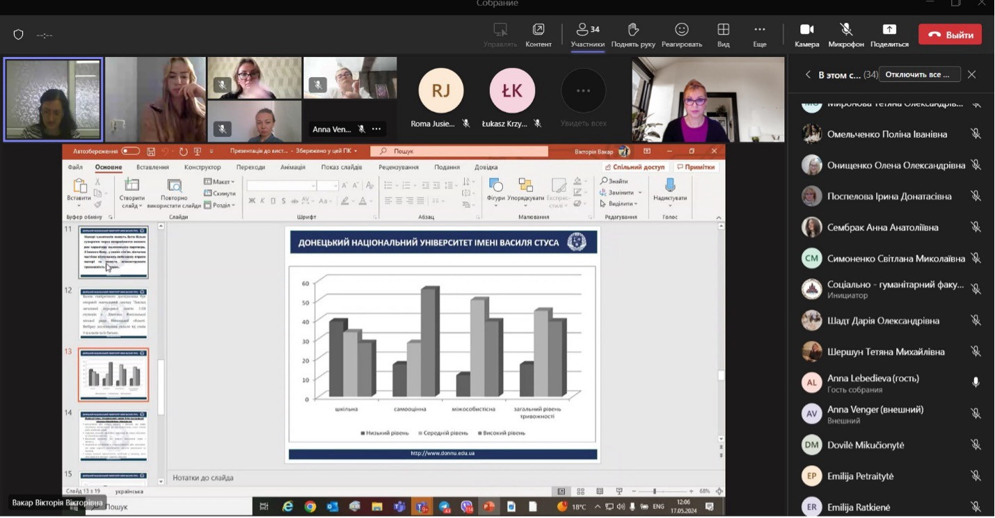 17 травня 2024 року в Університеті Ушинського було проведено чергову конференцію "Актуальні проблеми практичної психології", яка вже стала традиційною для кафедри теорії та методики практичної психології. Конференція зібрала широкий загал не лише вітчизняних фахівців, а й велике коло іноземних партнерів, яких залучили до співпраці викладачі кафедри теорії та методики практичної психології. Свої доповіді на пленарному засіданні представили науковці з європейських закладів освіти (м. Кишинів, Молдова; м. Краків, Польща; м. Вільнюс, Литва) та українських (м. Вінниця, м. Запоріжжя, м. Одеса, м. Харків). Крім того, вчені Університету Джонса Гопкінса (м. Балтимор, США) теж взяли участь у роботі конференції. На секційних засіданнях усю увагу було віддано виступам здобувачів вищої освіти. Атмосфера була дуже творчою, під час роботи виникали цікаві дискусії, питання, що ініціювали жваве обговорення поставлених проблем. Щира подяка декану соціально-гуманітарного факультету професору Оксані ВДОВІЧЕНКО та усьому складу кафедри теорії та методики практичної психології за активну участь у проведенні конференції.