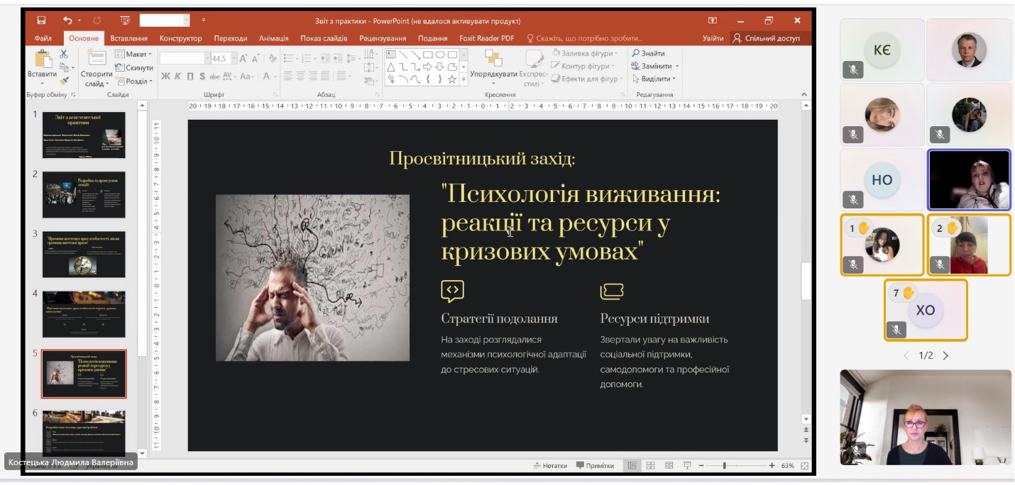 Під час практики магістранти розвинули професійні знання й навички, необхідні для організації навчального процесу та підготовки методичних матеріалів з психологічних дисциплін. Вони опанували роботу з кафедральною та факультетською документацією, навчилися складати плани-конспекти занять і розробляти навчальні презентації. Окрім того, магістри відпрацювали вміння організовувати та проводити просвітницько-виховні заходи з акцентом на проблематику екстремальної та кризової психології, вдосконалюючи свої комунікативні та аналітичні здібності в професійній діяльності.