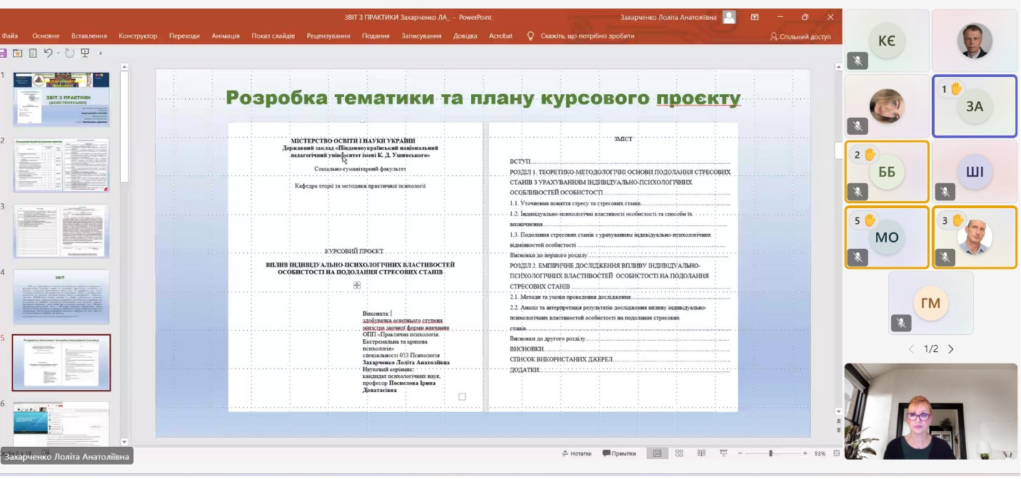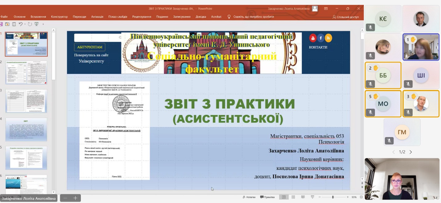 07 листопада 2024 року на кафедрі теорії та методики практичної психології Університету Ушинського відбулася підсумкова конференція виробничої (асистентської) практики для здобувачів 1 курсу ОПП "Практична психологія. Екстремальна та кризова психологія" за спеціальністю 053 Психологія (другий магістерський рівень вищої освіти, заочна форма навчання).