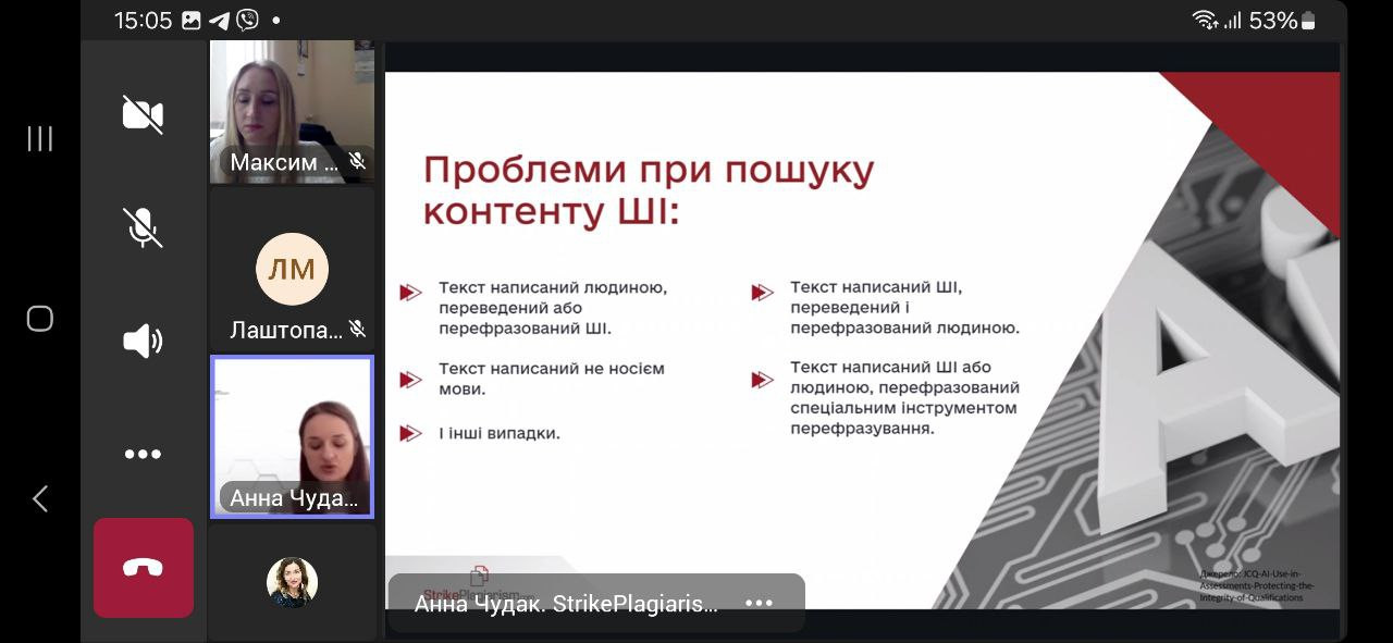 19 березня 2025 року науково-педагогічні працівники, здобувачі першого (бакалаврського) рівня вищої освіти спеціальності 028 «Менеджмент соціокультурної діяльності», здобувачі третього (освітньо-наукового) рівня вищої освіти спеціальності 033 «Філософія» долучилися до вебінару «Перевірка на плагіат як інструмент академічної доброчесності: аналіз звіту подібності + КП ШІ у StrikePlagiarism.com». Захід відбувся в межах «Тижня доброчесності в Університеті Ушинського». Захід розпочався з вітального слова Оксани Максим, директорки бібліотеки, Голови Групи сприяння доброчесності в Університеті Ушинського, яка наголосила на важливості академічної доброчесності в освітньому процесі. Спікерка – Анна ЧУДАК, менеджер з розвитку plagiat.pl (https://plagiat.pl/) в Україні. Учасники отримали практичні навички роботи із системою StrikePlagiarism.com, роз’яснення щодо оцінки текстів на плагіат та використання штучного інтелекту для перевірки доброчесності робіт. Дискусія підкреслила важливість таких заходів для формування культури доброчесності серед здобувачів вищої освіти. Активну участь в обговоренні теми взяла Інна Федорова, аспірантка 3-го року навчання. Академічна доброчесність – основа якісної освіти та наукової діяльності!