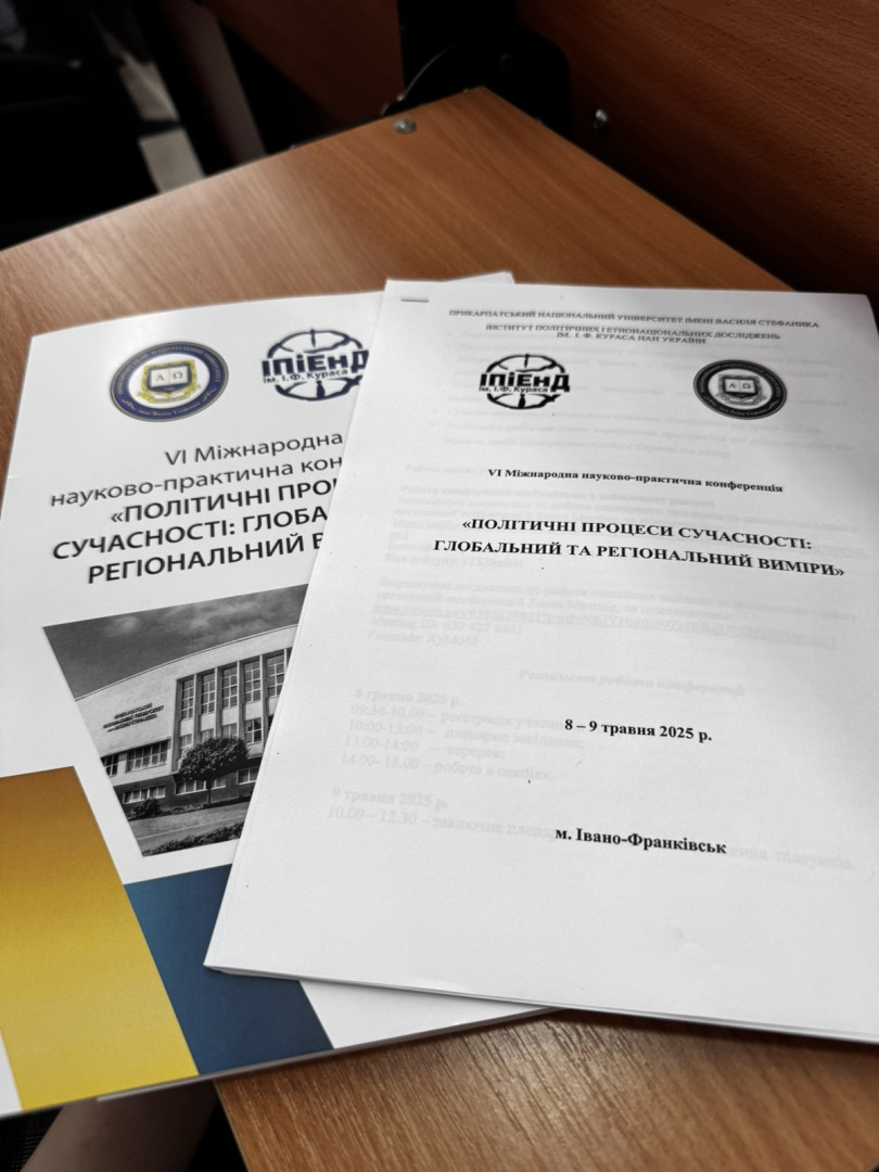 Кафедра політичних наук і права Університету Ушинського була гідно представлена на VI Міжнародній науково-практичній конференції «Політичні процеси сучасності: глобальний та регіональний виміри», що відбулася 8–9 травня 2025 року на базі Прикарпатського національного університету імені Василя Стефаника.Участь у цьому науковому заході взяли доцентка кафедри, кандидатка політичних наук Проноза Інна Іванівна разом із здобувачами магістрами та аспірантами спеціальності «Політологія» (освітня програма «Політологія. Українські та європейські студії»).