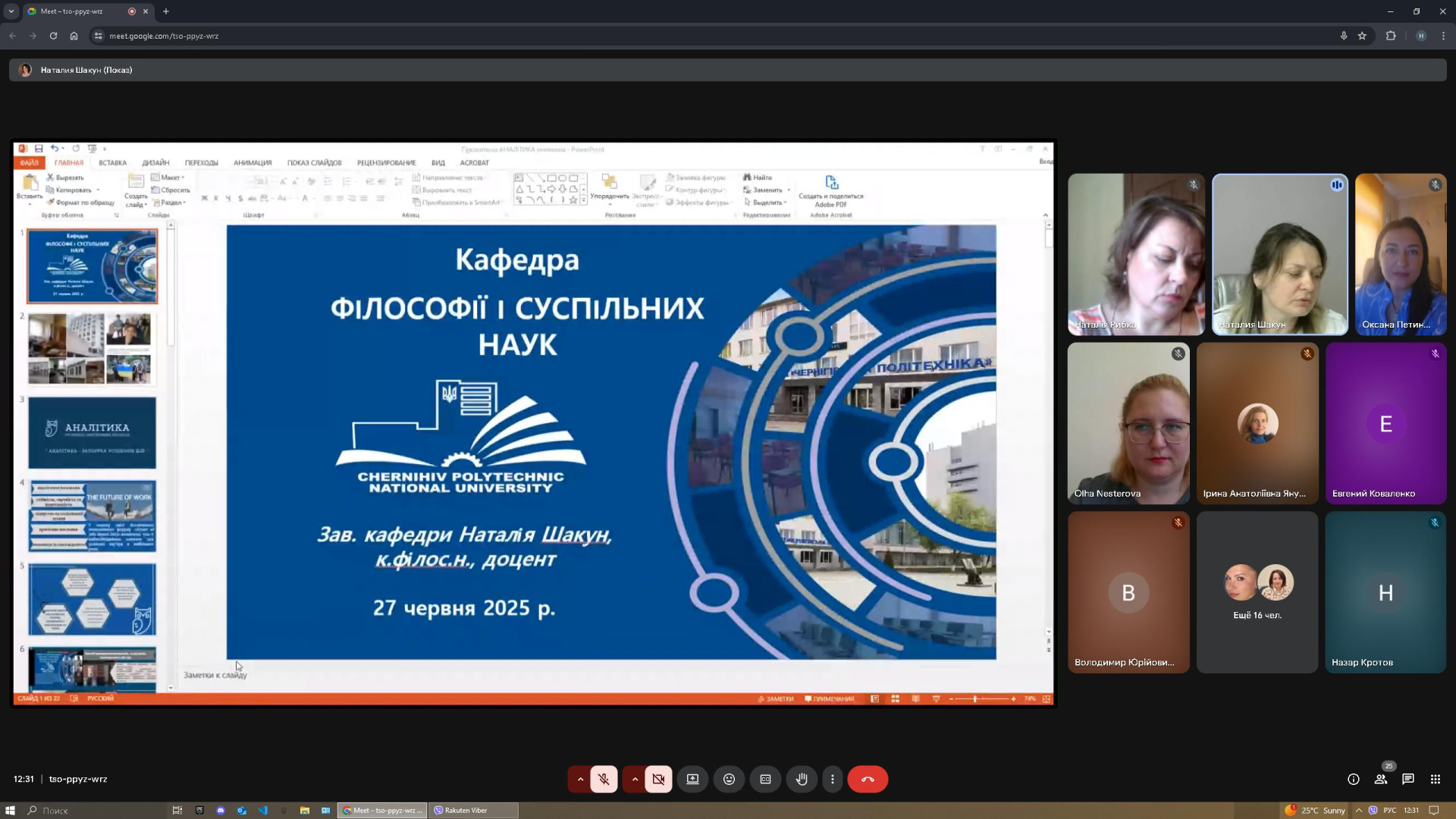 27 червня 2025 року відбувся міжвузівський круглий стіл, який об'єднав філософські спільноти кількох провідних університетів України. Захід став потужною платформою для міжінституційного діалогу, обміну досвідом і спільного осмислення ролі філософії в умовах війни та трансформаційного періоду в історії нашої країни. Щиро вдячні міжнародному проєкту «SCIENCE AT RISK», заснованому Академічною мережею Східної Європи, за допомогу в організації цієї події. Допомога, спрямована на підтримку українських науковців, які постраждали внаслідок війни, є значним внеском у збереження інтелектуального потенціалу та розвитку академічної культури України. Співорганізатори заходу – наша кафедра та кафедра філософії, історії та політології Одеської політехніки. Модератори – доц. Наталія Рибка (Одеська політехніка) та проф. Оксана Петінова (Університет Ушинського). Захід включав дві змістовні панелі: Панель 1. «Філософія в контексті освіти, пам’яті та викликів сучасності» – обговорено ключові напрями філософської думки у складних історичних обставинах. У центрі уваги – нові орієнтири вищої освіти, історична пам’ять як чинник культурного спротиву, етична рефлексія у кризові часи та потенціал філософії як інструменту психологічного впливу в аудиторії. Спікери – проф. Володимир Жарких, доц. Алла Федорова, проф. Олександр Афанасьєв, доц. Ірина Янушевич, доц. Наталя Рибка. Панель 2. «Педагогічні технології та психологічні інновації» – учасники ділилися досвідом викладання філософії в умовах війни, трансформаціями навчального процесу та інноваційними підходами до формування критичного мислення. Фокус було зосереджено на адаптації філософської освіти до нових викликів, а також на впровадженні інноваційних підходів в умовах невизначеності. Особлива подяка учасникам ЗВО-партнерів: доц. Ользі Нестеровій (НТУ «Дніпровська політехніка»), доц. Наталії Шакун (НУ «Чернігівська політехніка»), студентам Нікіті Стрєлку та Світлані Буглак (ОП «Аналітика суспільно-політичних процесів»), які презентували потужне бачення філософії як середовища критичного мислення для молоді.