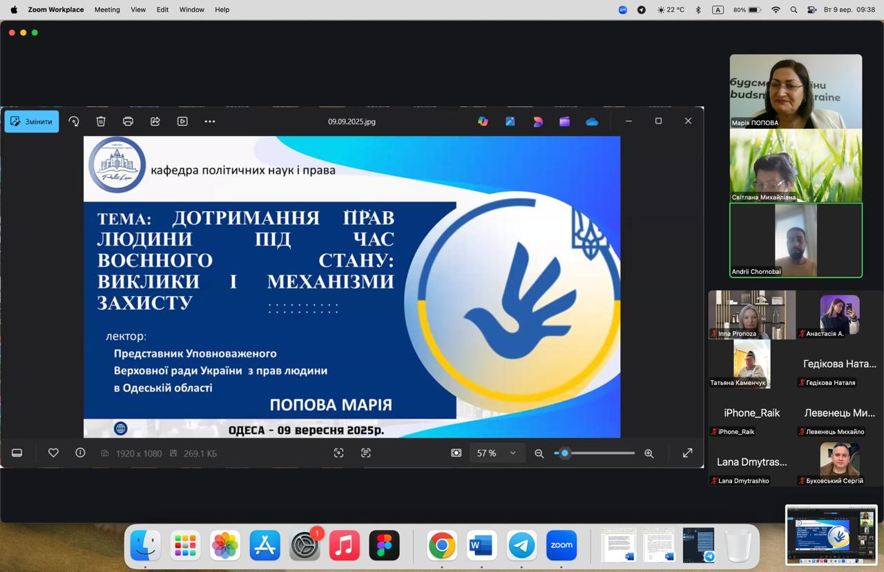 9 вересня 2025 року на кафедрі політичних наук і права Університету Ушинського відбулася гостьова лекція професіонала-практика на тему «Дотримання прав людини під час воєнного стану: виклики і механізми захисту». Лектором виступила Марія Попова, кандидат політичних наук, територіальний Представник Уповноваженого Верховної Ради України з прав людини в Одеській області.