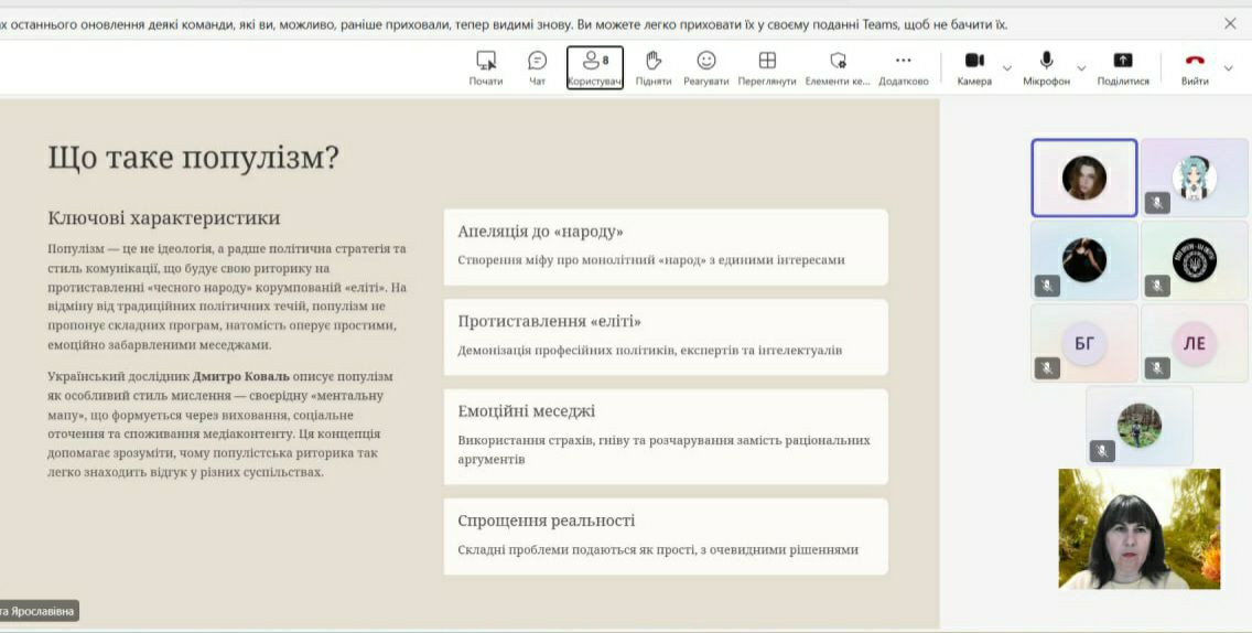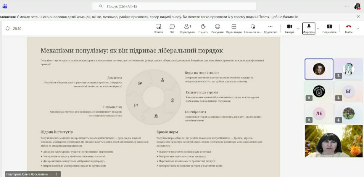 Учасники гуртка активно долучилися до обговорення актуальної проблеми: порівнювали державну політику, ідеологію, соціальну політику Д. Трампа, Дж. Мелоні, В. Орбана; описували сценарії зворотного демократичного транзиту; пропонували шляхи збереження і дієвого захисту демократій; аналізували ставлення до правих популістів в ЄС, наголошували, що не існує єдиного транснаціонального союзу правих популістів та визначили, що ставлення в ЄС до правих популістів залежить від їх дій стосовно збереження європейської унії.