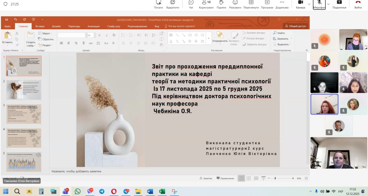 Image0111 грудня 2025 року було проведено підсумкову конференцію з переддипломної практики для магістрів 2 курсу денної форми навчання за ОПП «Практична психологія. Екстремальна та кризова психологія». Під час підсумкової конференції магістри презентували результати виконання завдань переддипломної практики, що охоплювали організаційно методичну, науково дослідну та індивідуальну навчально дослідну діяльність. Здобувачі здійснили узагальнення результатів констатувального або формувального експерименту з тематики магістерських робіт та представили їх у вигляді таблиць, діаграм і наочних матеріалів, а також продемонстрували вміння оформлювати список використаних джерел відповідно до стандарту ДСТУ 8302:2015.