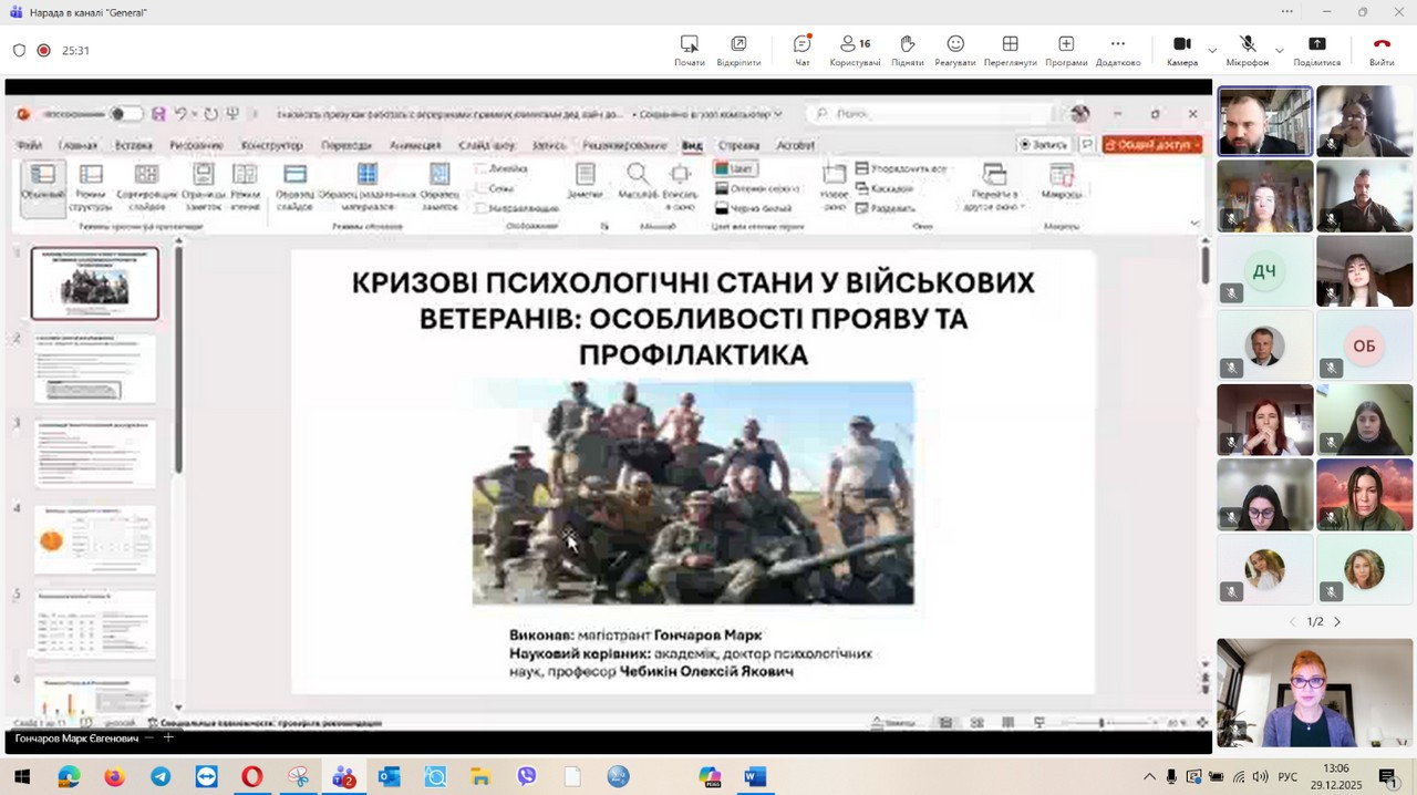 29 грудня 2025 року відбувся захист кваліфікаційних (магістерських) робіт здобувачів денної форми навчання за зазначеною освітньо-професійною програмою. Представлені магістерські дослідження продемонстрували високий рівень інтеграції теоретичних положень сучасної психологічної науки з практичними завданнями професійної діяльності психолога в умовах підвищеного стресу, невизначеності та соціальних трансформацій, зумовлених воєнним станом. Зміст робіт охоплював широкий спектр проблем, пов’язаних із психологічним супроводом особистості в кризових та екстремальних умовах, дослідженням адаптаційних можливостей, стресостійкості та ресурсного потенціалу людини, а також розробкою й апробацією практичних моделей психологічної допомоги різним категоріям населення. Особливий акцент було зроблено на аналітичному осмисленні складних психологічних феноменів, умінні обґрунтовувати вибір методів психодіагностики та психокорекції, а також на професійній рефлексії результатів власного дослідження. За результатами захисту підтверджено, що випускники денної форми навчання за освітньо-професійною програмою «Практична психологія. Екстремальна та кризова психологія» досягли програмних результатів навчання, які передбачають здатність аналізувати та інтерпретувати поведінку людини в екстремальних ситуаціях, прогнозувати психологічні наслідки дії кризових чинників, ефективно організовувати професійну взаємодію та приймати відповідальні рішення в умовах підвищеної напруги. Магістранти продемонстрували готовність до надання кваліфікованої психологічної допомоги особистості у кризовому стані, спрямованої на мобілізацію її внутрішніх ресурсів, підтримку життєстійкості та психологічного відновлення, зокрема в умовах війни.