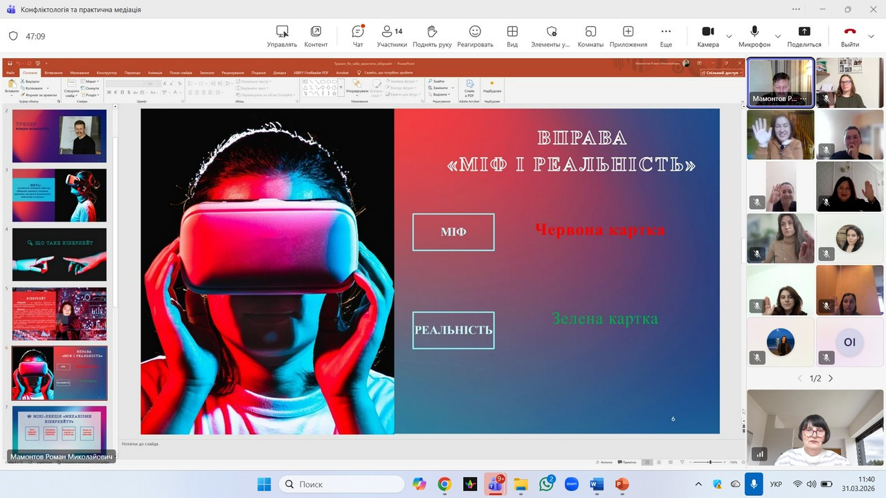 31 березня в онлайн форматі відбувся тренінг «Як себе захистити від кіберхейту» у рамках Міжнародного проєкту DAAD-57834338 «Транснаціональні освітні та дослідницькі стратегії проти цифрової ненависті – 2026» (Німеччина, Україна, Молдова, Киргизстан). Тренінг провів магістрант 1 курсу спеціальності Прикладна та практична психологія Інституту психології та суспільних наук Університету Ушинського Роман Мамонтов за підтримки медіатора Ірини Бринзи. Метою тренінгу стало розвінчання поширених міфів про кіберхейт, навчання учасників критичному мисленню та вмінню розпізнавати небезпечні установки У програмі також було застосовано міні-лекцію «Механізми кіберхейту» та інтерактивні вправи, спрямовані на формування розуміння явища цифрової ненависті та практичні навички протидії йому.
