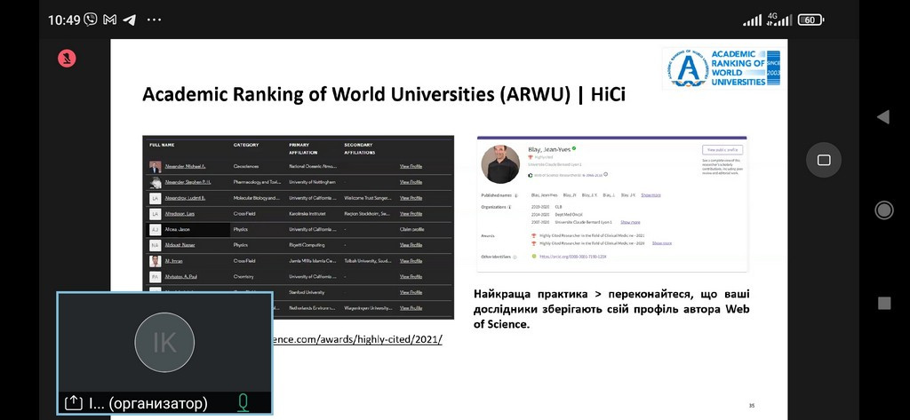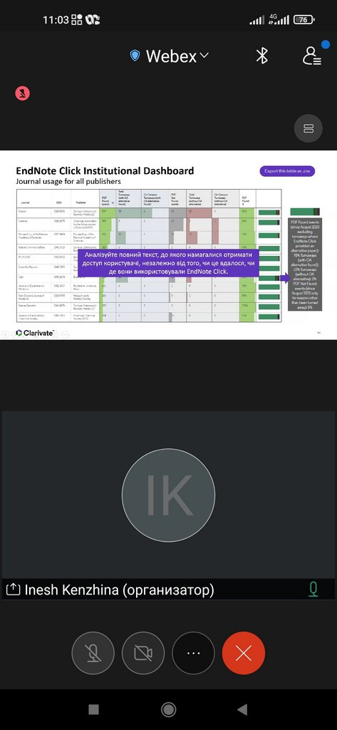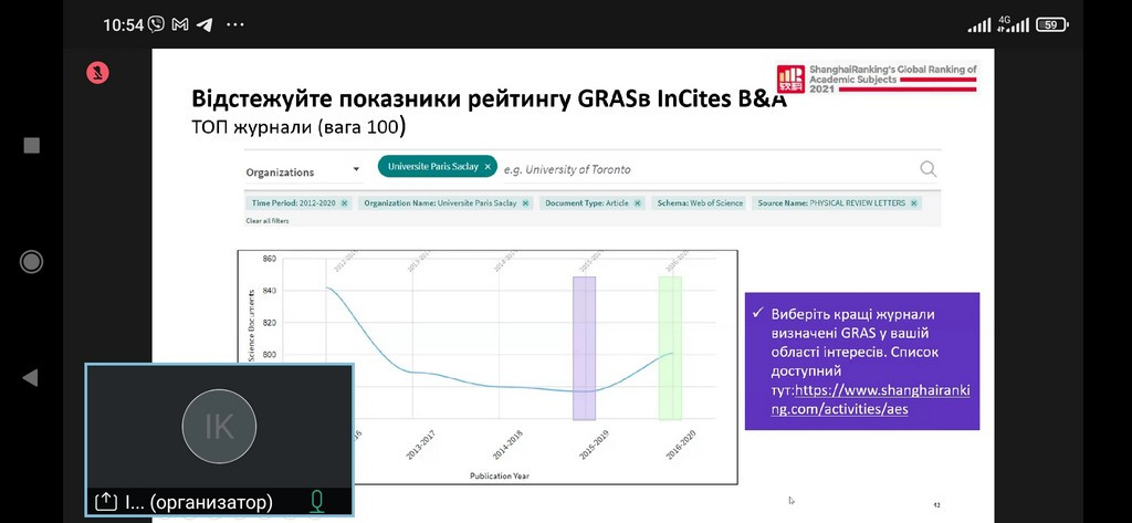 Розглянуто питання використання інструментів Web of Science, в тому числі, Master Journal List, Journal Citation Reports і InCites, для керування своїми колекціями та визначення найефективніших журналів для ЗВО, з’ясовано особливості класифікації Global Ranking of Academic Subjects (GRAS) Shanghai GRAS, що заснована на відображенні категорій Web of Science для 54 навчальних предметів відповідно до методології GRAS. Учасники дізналися про те, як рішення, дані та послуги Clarivate можна використовувати для підтримки стратегії підвищення рейтингу університетів.