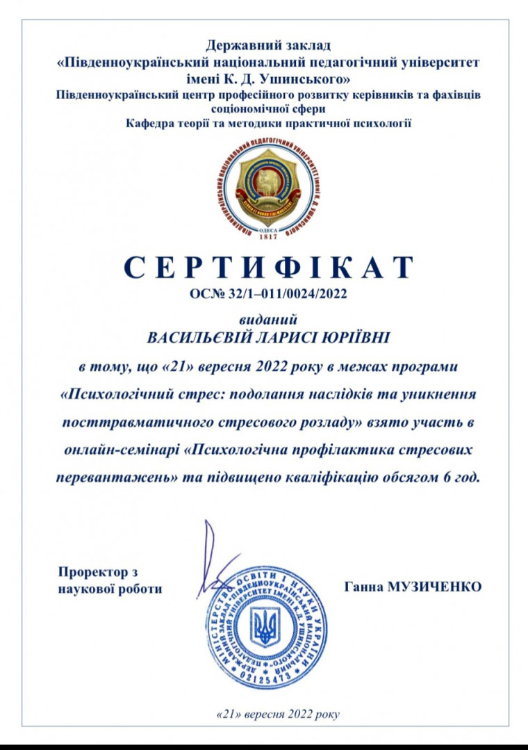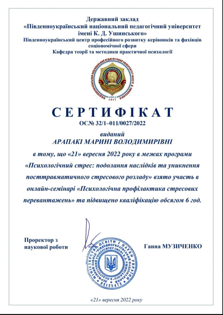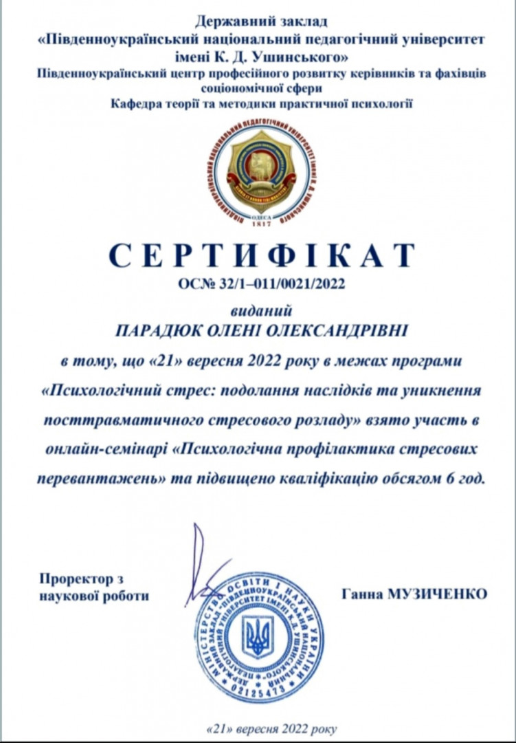 21 вересня 2022 року на базі Південноукраїнського центру професійного розвитку керівників та фахівців соціономічної сфери Університету Ушинського відбулося підвищення кваліфікації за програмою «Психологічний стрес: подолання наслідків та уникнення посттравматичного стресового розладу» для молодих вчених та здобувачів вищої освіти, головна мета якого - набуття нових знань та навичок у сфері психологічної підтримки учасників освітнього процесу під час навчання та у повсякденному житті