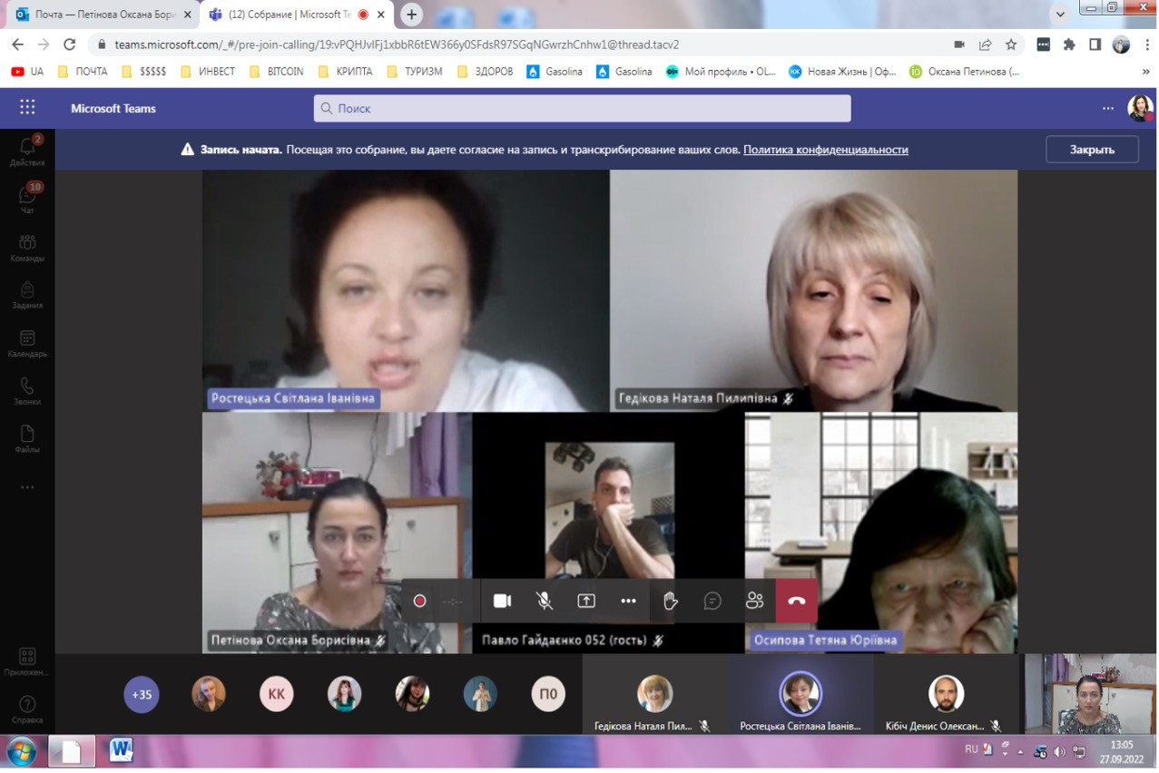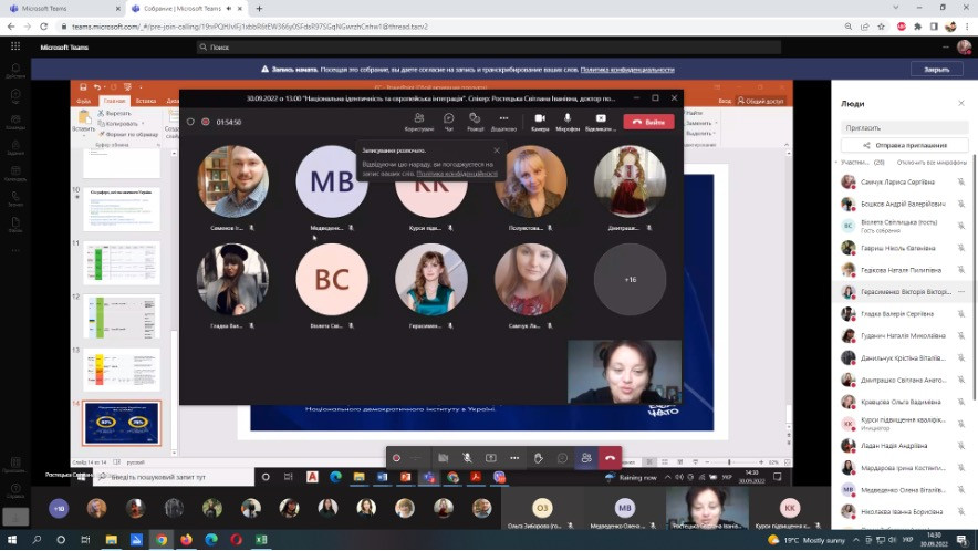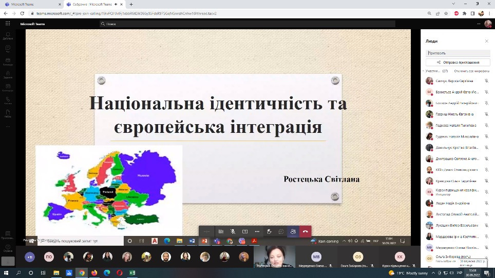 27 та 30 вересня 2022 року науково-педагогічні працівники кафедри філософії, соціології та менеджменту соціокультурної діяльності (проф. Оксана Петінова, викл. Лариса Самчук), аспіранти ОНП Філософія (Олена Парадюк, Іванна Ніколаєва, Марина Арапакі, Людмила Городнюк, Віолета Світлицька, Ігор Семенов), здобувачі вищої освіти ОПП Культурологія та ОПП Менеджмент соціокультурної діяльності за першим (бакалаврським) рівнем (Крістіна Данильчук, Ніколь Гавриш, Надія Ладан, Євгенія Шабатура, Яна Грицак, Валерія В’язова) узяли участь у корпоративному навчанні на базі Південноукраїнського центру керівників та фахівців соціономічної сфери (керівник – проф. Наталія ЧЕРНЕНКО) за програмою «Статус кандидата на вступ до ЄС: виклики та можливості для України» й «Національна ідентичність та європейська інтеграція». Спікер – доктор політичних наук, доцент кафедри політичних наук і права Університету Ушинського Світлана Ростецька. Під час онлайн-семінарів усі присутні ознайомились з процедурою, перевагами та недоліками вступу до ЄС для України, обговорили важливість цього кроку для українського суспільства. Щиро вдячні організаторам за підготовку семінару щодо таких актуальних для України питань.