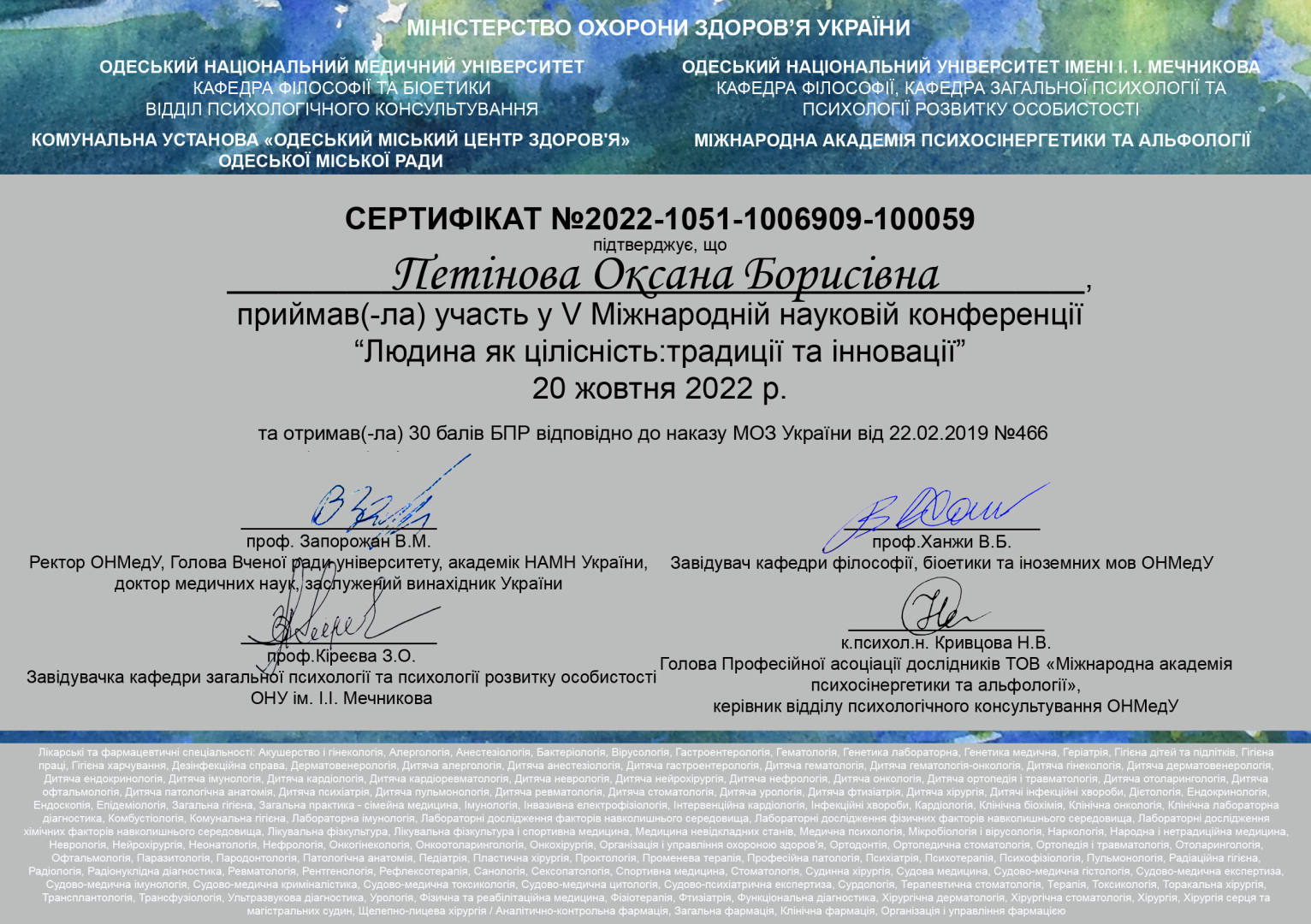 120 жовтня 2022 р. науково-педагогічні працівники кафедри філософії, соціології та менеджменту соціокультурної діяльності Університету Ушинського взяли участь у V Міжнародній науковій конференції на тему «Людина як цілісність: традиції та інновації». Метою конференції є залучення наукової спільноти до трансдисциплінарної дискусії щодо проблем людського буття, стимулювання і підтримка науки в Україні, розвиток міжнародної співпраці. Розглянуто низку теоретичних і практичних питань щодо особистісного та соціального буття людини в рамках сучасного соціально-гуманітарного та природничо-наукового дискурсів за такими напрямами: антропологічний вимір сучасного знання; філософсько-методологічні та етичні проблеми сучасної медицини та психології; проблема цілого і цілісності у сферах філософії, науки, релігії та мистецтва; темпорально-історичні особливості людського існування і діяльності; антропологічне значення сучасної когнітивної науки; суспільні, психологічні та соматичні складові здоров’я в контексті сучасних викликів; біоетичні аспекти становлення та проблеми збереження людської цілісності; нормативні правила охорони здоров’я та їх юридичне обґрунтування; індивідуальне і типове в дослідженні психологічного та соціального здоров’я та інші. В рамках конференції відбулося засідання Круглого столу, присвяченого 20-річному ювілею Одеського відділення Українського синергетичного товариства.