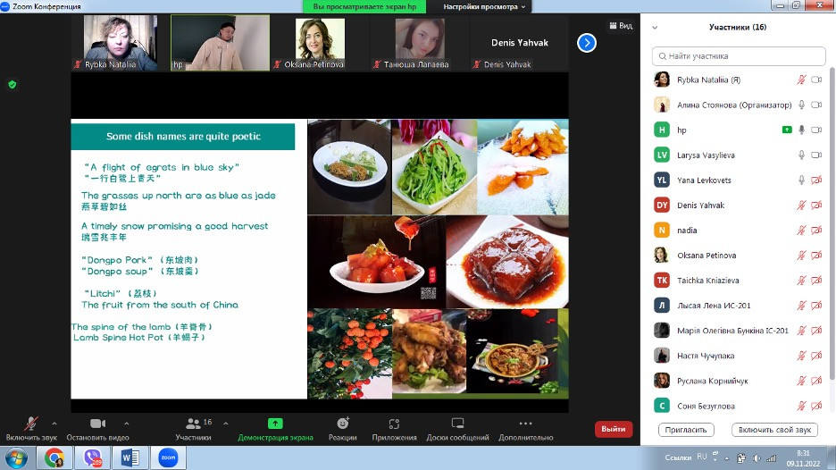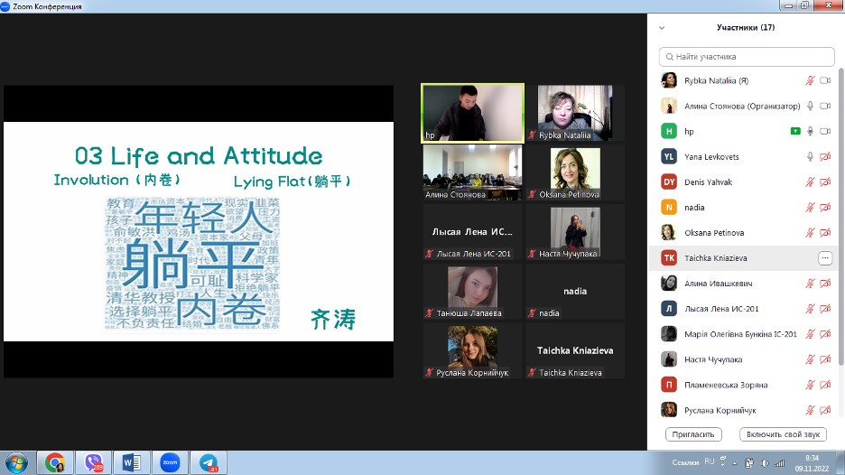 1В рамках україно-китайського освітньо-наукового проєкту «Освіта в глобалізованому суспільстві: філософія, менеджмент, культура (сучасні тенденції, економічні опції та міжнародні практики)» (Університет Ушинського – Аньхойський університет фінансів та економіки) 9 листопада 2022 року було проведено інтерактивний захід «Healthy – Lifestyle». Організатори – куратори проєкту проф. Оксана Петінова та викл. Катерина Ткаченко. В заході взяли участь здобувачі першого (бакалаврського) рівня вищої освіти ОПП «Середня освіта. Українська мова і література», «Середня освіта (історія)», «Культурологія», «Філософія», «Менеджмент соціокультурної діяльності». Зокрема, презентацію на тему «Туристичні місця України» підготували студентки 1 року навчання спеціальності 014 Середня освіта. Українська мова і література Надя Ван Дер Мерве та Дар’я Казак. Огляд культури та способу життя китайської молоді представили студенти різних факультетів Аньхойського університету фінансів та економіки, зокрема, Інституту медіа та комунікацій.