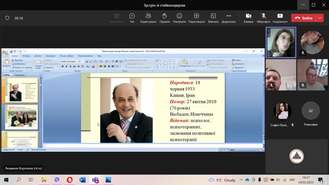24.02.2023 року відбулася зустріч здобувачів першого (бакалаврського) та другого (магістерського) рівня вищої освіти за спеціальністю 053 Психологія ОПП Психологія зі стейкголдером Людмилою Корольовою - психотерапевтом у методі позитивна і транскультурна психотерапія, практикуючим психологом у Південноукраїнському інституті психології, психотерапії і управління.