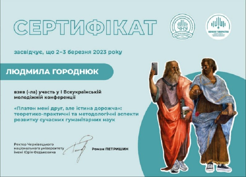 Здобувачка третього (освітньо-наукового) рівня вищої освіти ОНП Філософія Людмила Городнюк взяла участь в науковій конференції «Платон мені друг, але істина дорожча: теоретико-практичні та методологічні аспекти розвитку сучасних гуманітарних наук», яка проходила 2-3 березня в Чернівецькому національному університеті імені Юрія Федьковича на базі філологічного факультету, де представили свої наукові розвідки молоді вчені і студенти з різних куточків України.