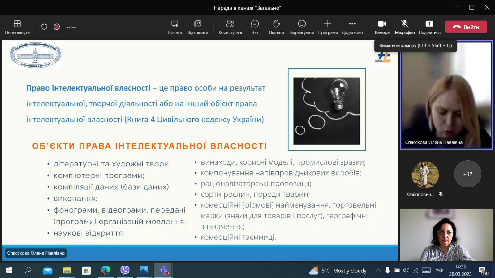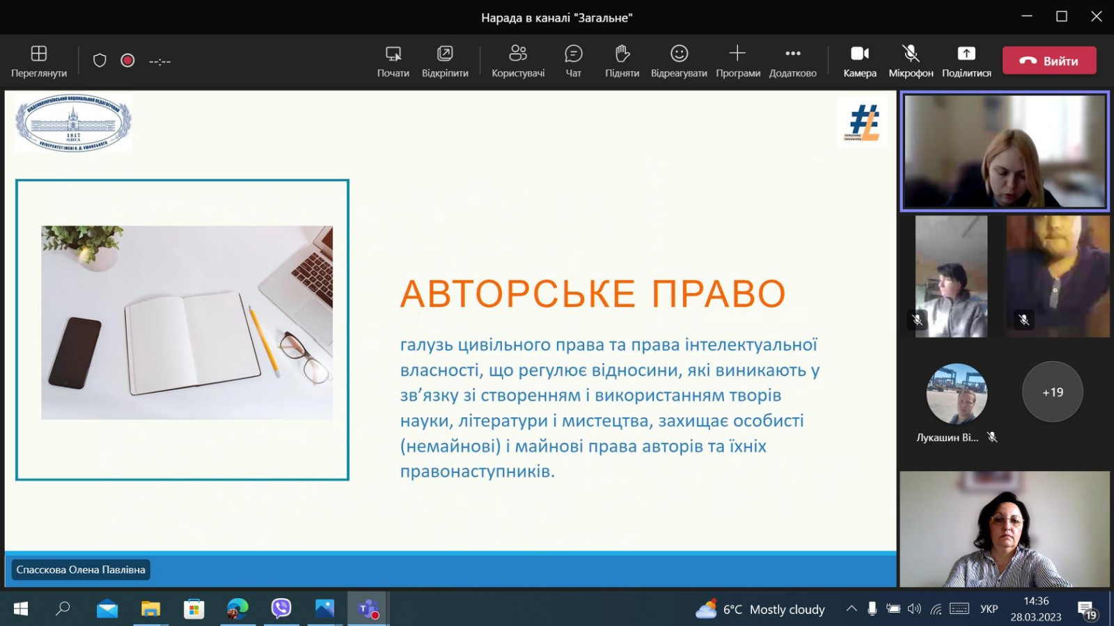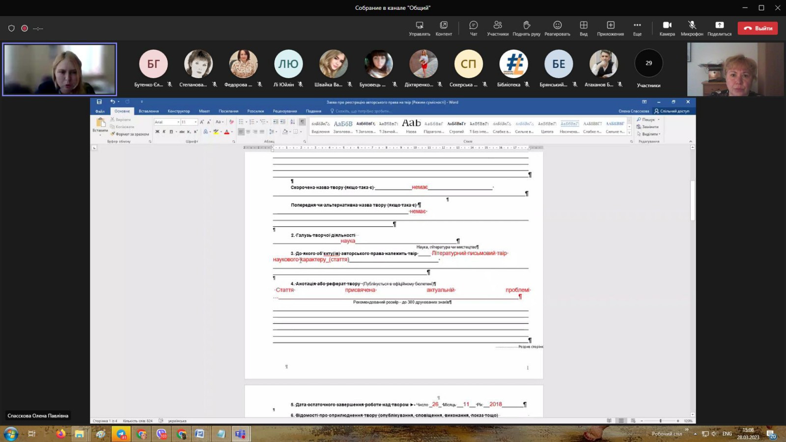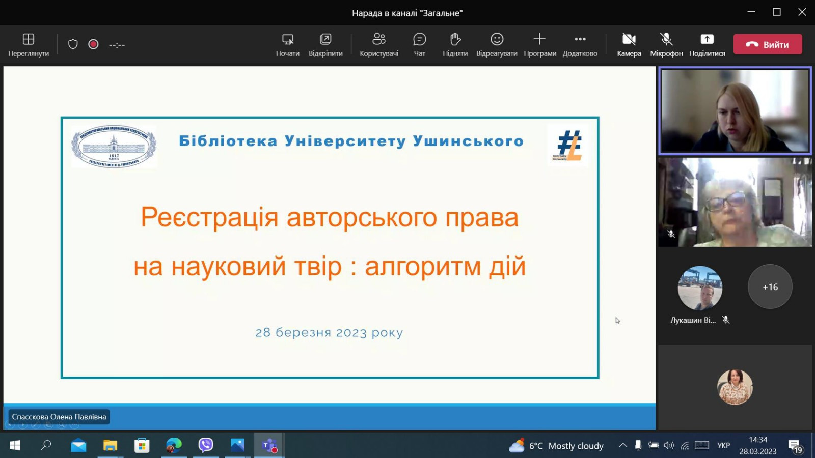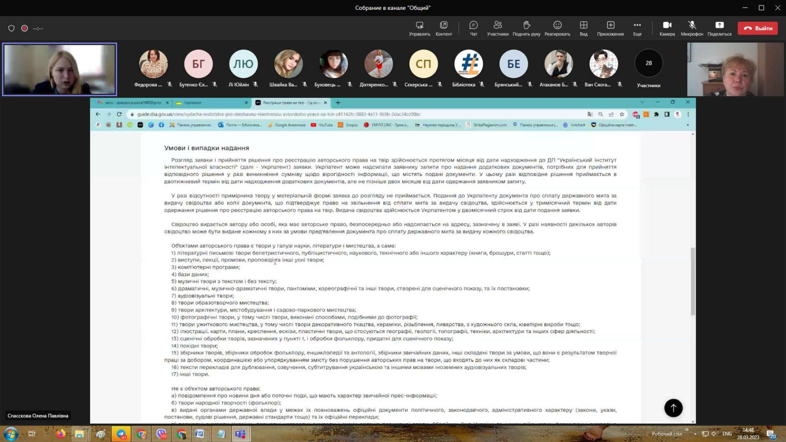 128 березня 2023 року здобувачі третього (освітньо-наукового) рівня вищої освіти ОНП «Філософія» (Інна Федорова, Людмила Городнюк, Елеонора Бутенко та інші) та науково-педагогічні працівники кафедри філософії, соціології та менеджменту соціокультурної  діяльності долучилися до вебінару «Реєстрація авторського права на науковий твір: алгоритм дій», який був організований співробітниками бібліотеки Державного закладу «Південноукраїнський національний педагогічний університет імені К. Д. Ушинського». Директор бібліотеки Олена Спасскова розповіла про послідовність проходження реєстрації  авторського права на науковий твір, розглянули питання законодавства про авторське право, підписання документів кваліфікованим цифровим підписом.