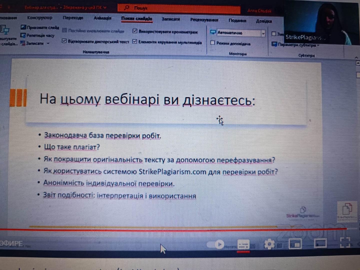4 квітня о 17 годині викладачи кафедри загальної і диференціальної психології Ульянова Т. Ю., Меленчук Н.І., Гордієнко І.О. і здобувачі другого (магістерського) рівня вищої освіти, які навчаються за освітньо-професійною програмою «Практична психологія» за спеціальністю 053 Психологія відвідали вебінар "Як збільшити оригінальність роботи?"
