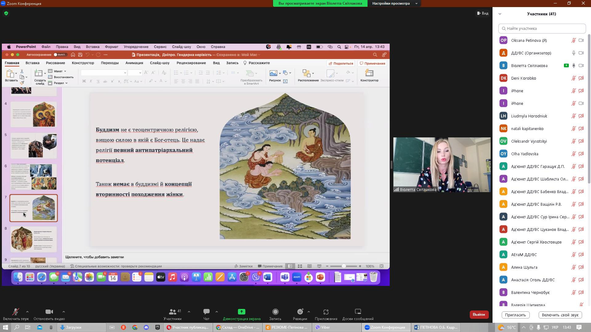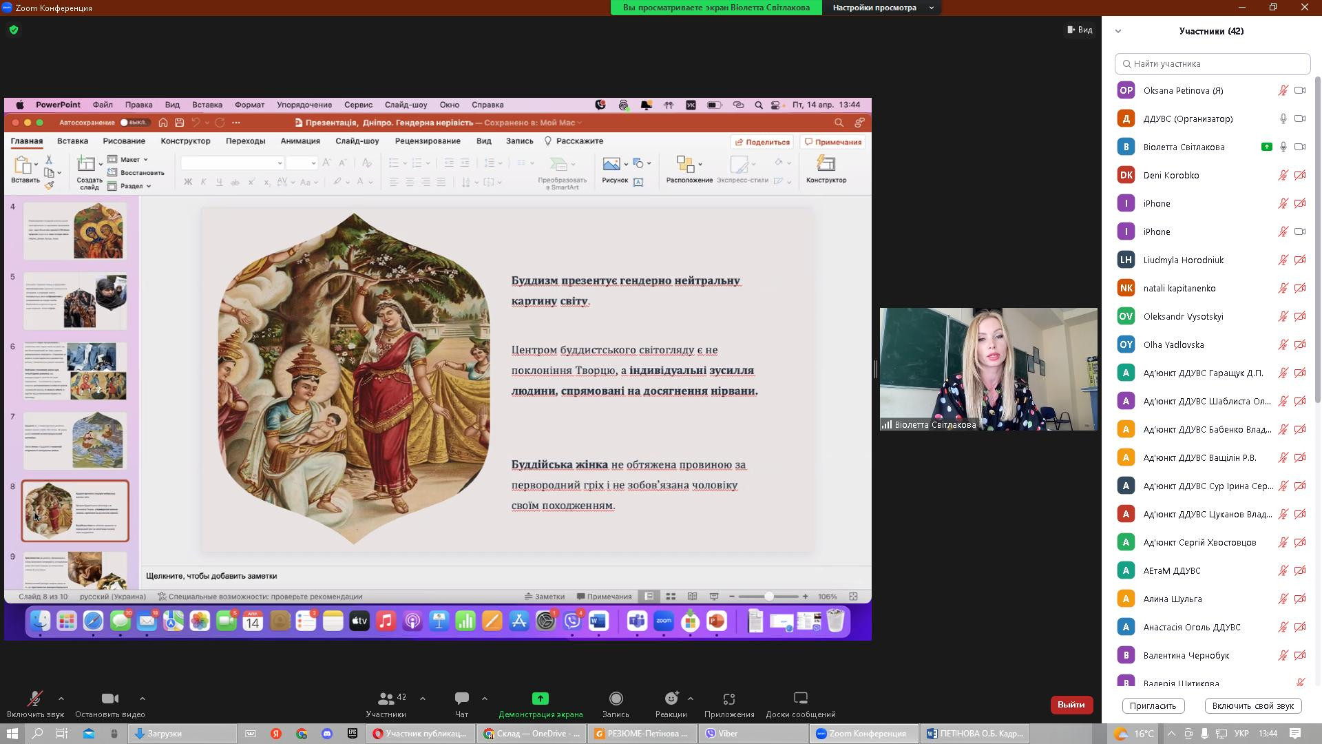 14 квітня 2023 року в рамках реалізації договору про співпрацю між ЗВО-партнерами НПП кафедри філософії, соціології та менеджменту соціокультурної діяльності, здобувачі першого (бакалаврського) та третього (освітньо-наукового) рівня вищої освіти Університету Ушинського взяли участь у міжнародній науково-практичній конференції «Соціально-гуманітарні виміри правової держави», організатором якої є кафедра міжнародних відносин та соціально-гуманітарних дисциплін Дніпропетровського державного університету внутрішніх справ (ЗВО-партнер). Головною метою конференції було обговорення актуальної інформації та обміну практичним досвідом щодо перспектив розвитку соціально-гуманітарних наук в умовах воєнного стану. Серед тематичних напрямів конференції - проблеми держави та суспільства в умовах війни; правова держава та громадянське суспільство; трансформація влади та законодавства в Україні як фактор європейського розвитку українського суспільства; глобальні політико-правові проблеми міжнародного простору; національні пріоритети гуманітарного розвитку України; гендерна рівність як складова правової держави. Зокрема, з апробацією проміжної наукової розвідки дисертаційного дослідження виступила здобувачка 1-го року навчання Віолета Світлицька з темою «Гендерна дискримінація жінок у положеннях основних релігійних вчень: ісламі, християнстві та буддійській традиції». До обговорення залучились представники наукового співтовариства різних ЗВО, дискусійними виявились аспекти гендерної дискримінації жінок в ісламі. Активну участь у конференції взяли аспіранти Інна Федорова, Марина Арапакі, Ігор Семенов та Людмила Городнюк.