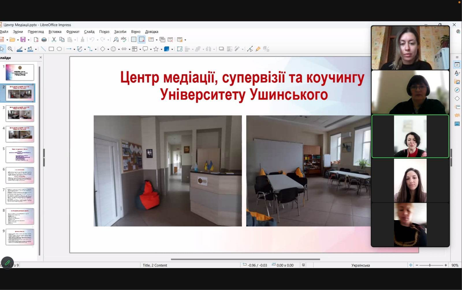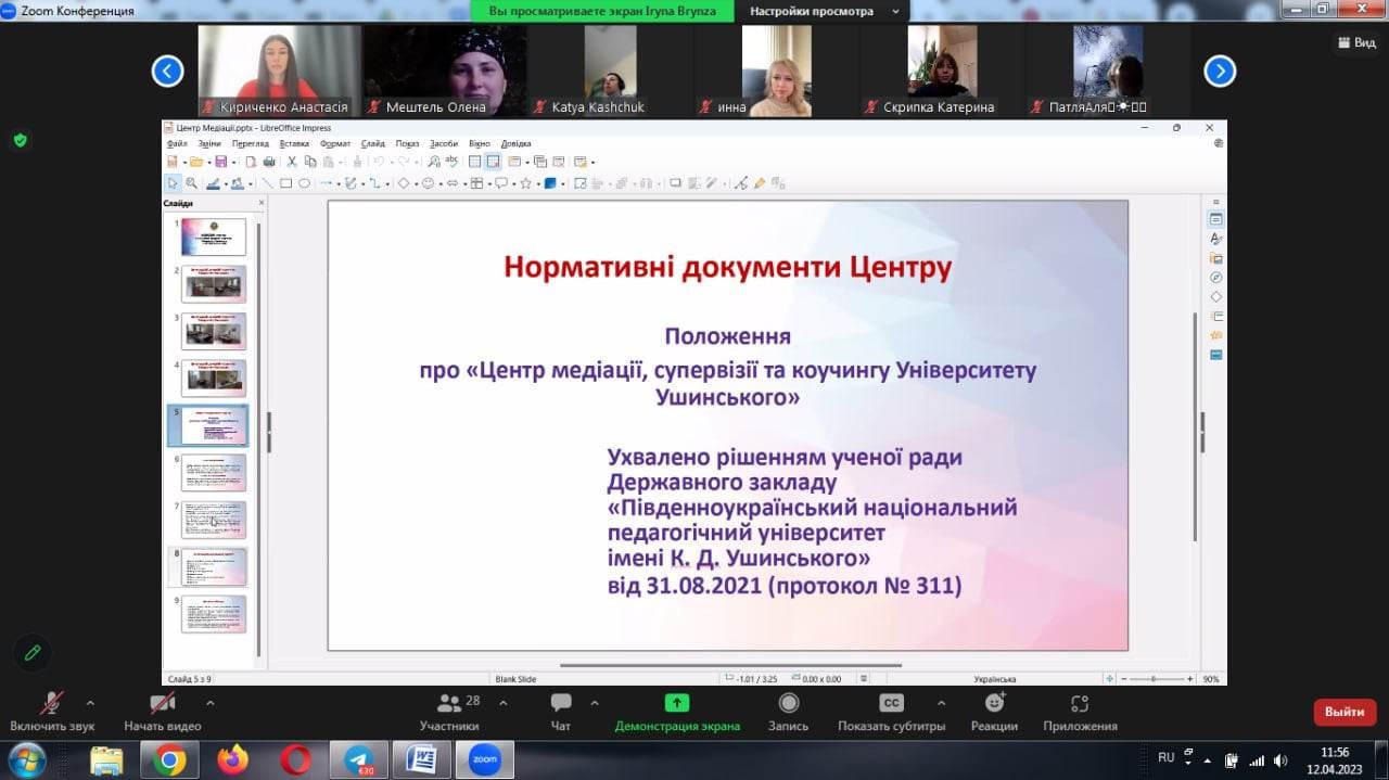 На базі «Центру медіації, супервізії та коучингу Університету Ушинського» 12 квітня, в період навчальної практики здобувачів другого (магістерського) рівня вищої освіти, які навчаються за освітньо-професійною програмою «Практична психологія» за спеціальністю 053 Психологія (1 курс денне відділення) відбувся захід щодо знаймства з базою практики.