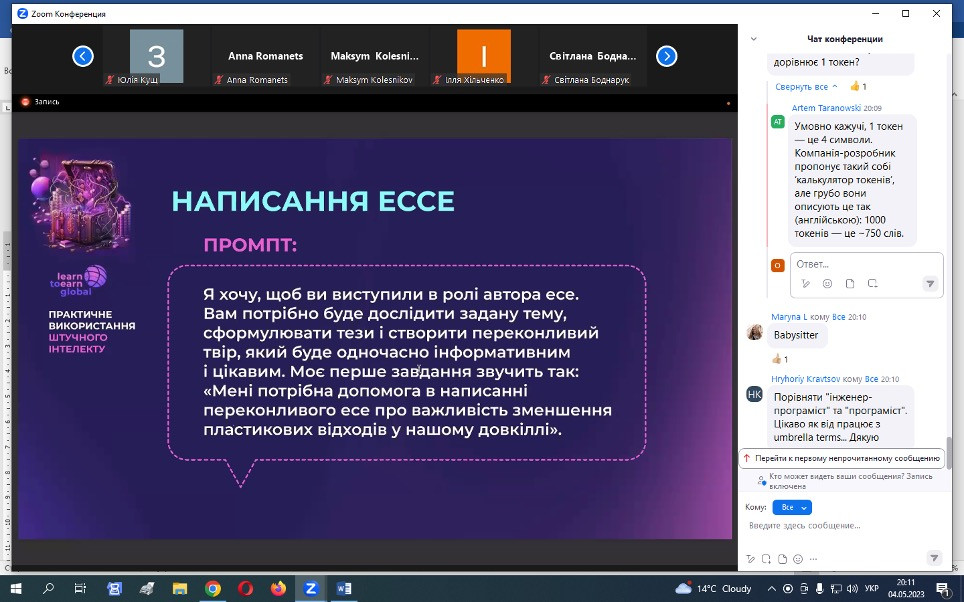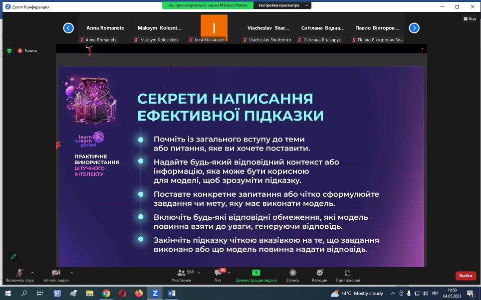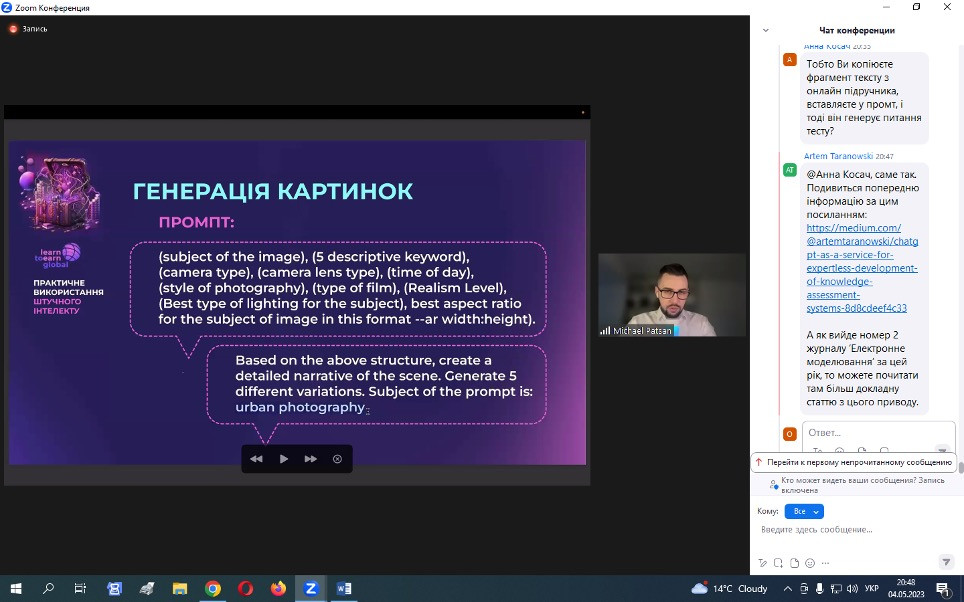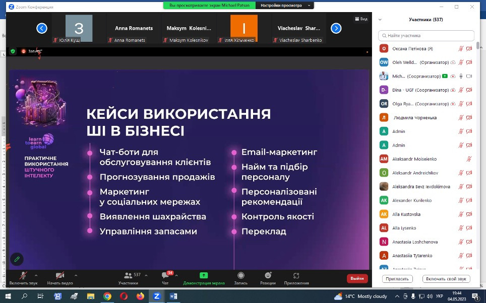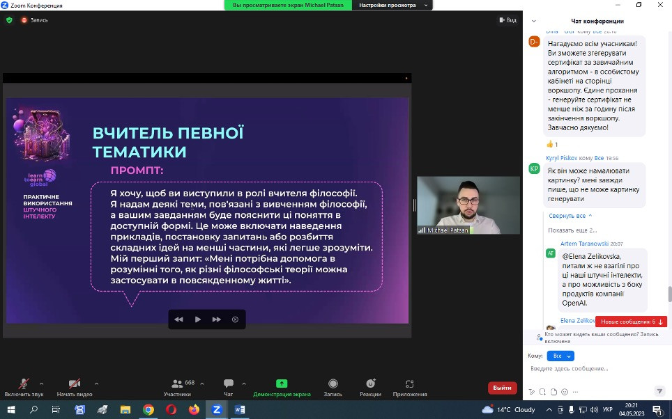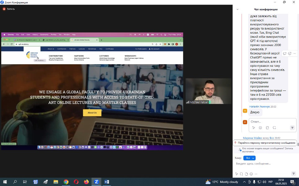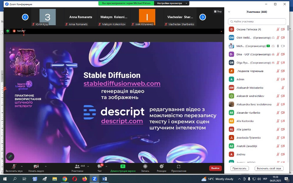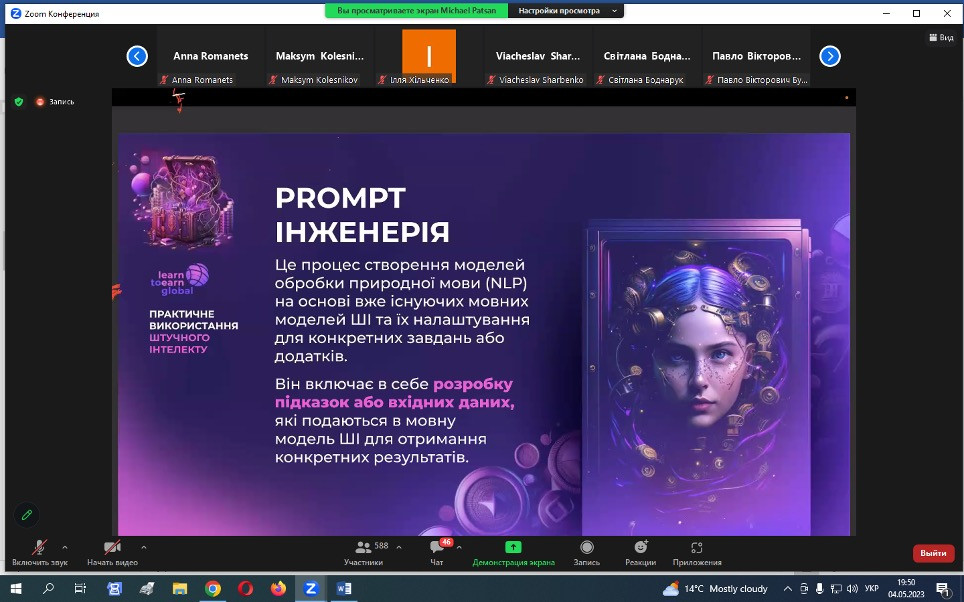15 травня 2023 року НПП кафедри філософії, соціології та МСКД та здобувачі третього (освітньо-наукового) рівня ОНП «Філософія» взяли участь у воркшопі «Як використовувати ШІ», що був організований UGF – некомерційною ініціативою, яка координується благодійною організацією K.FUND, працює під патронатом Міністерства освіти і науки України за грантової підтримки Українського фонду стартапів.Спікер воркшопу – Михайло Пацан, – інвестор, підприємець, експерт з міжнародних фінансових ринків та криптовалют, фінансовий радник, засновник Web3-університету професій майбутнього «Learn to Earn Global». Питання, що винесені на обговорення: що таке ШІ, його тип і застосування; популярний штучний інтелект: ChatGPT, MidJourney, Dall-E 2, Whisper та інші нейронні мережі з текстом у ChatGPT; приклади застосування нейронних мереж для маркетингу, продажів, рекрутингу, бізнес-процесів і особистої продуктивності. Особливо дискусійними стали питання захисту інтелектуальної власності та плагіату.