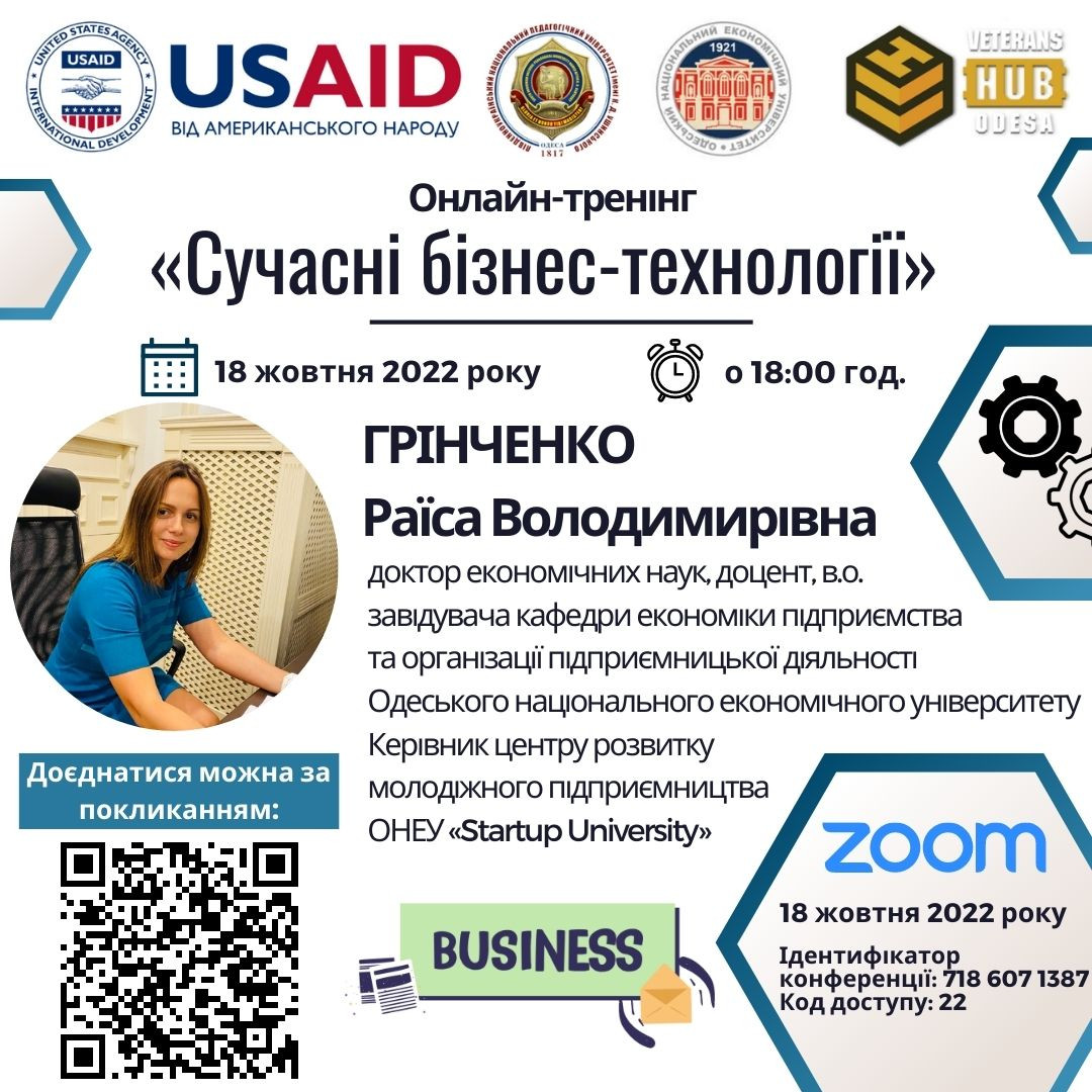 Спікером виступила Грінченко Раїса Володимирівна, доктор економічних наук, доцент, в.о. завідувача кафедри економіки підприємства та організації підприємницької діяльності Одеського національного економічного університету, керівник центру розвитку молодіжного підприємництва ОНЕУ «Startup University». Під час тренінгу "Сучасні бізнес-технології" учасники проєкту ознайомилися з специфікою бізнес-технологій, їх ознаками та видами, а саме: франчайзинг, лізинг, факторинг, аутсорсинг, кешбек, кластер.