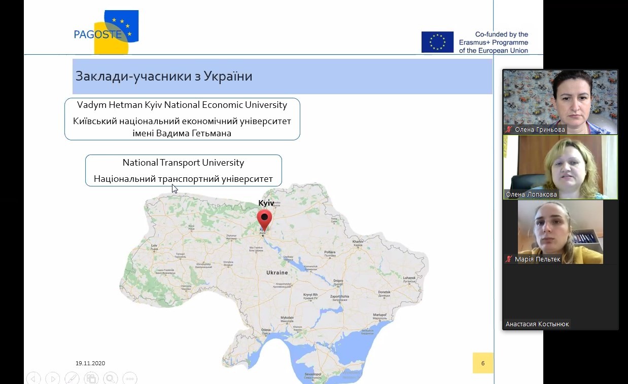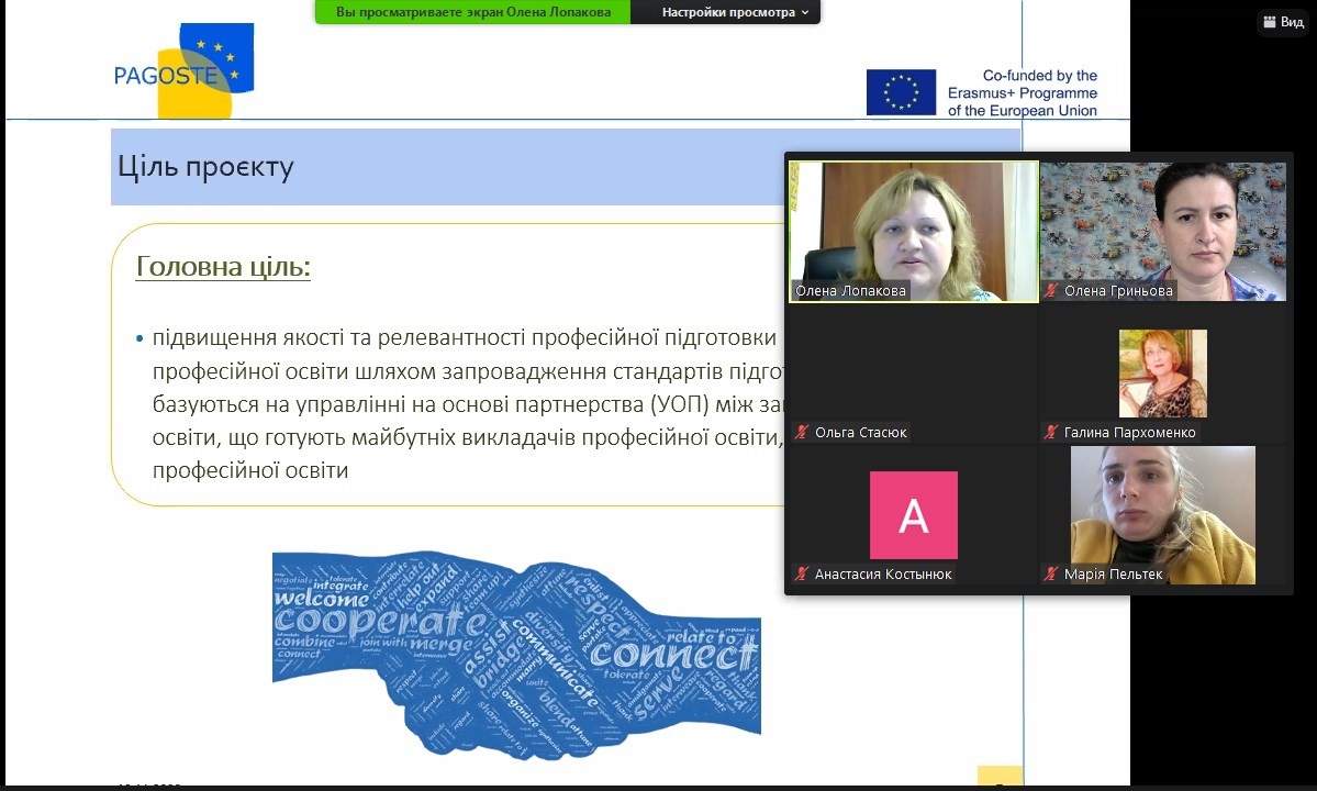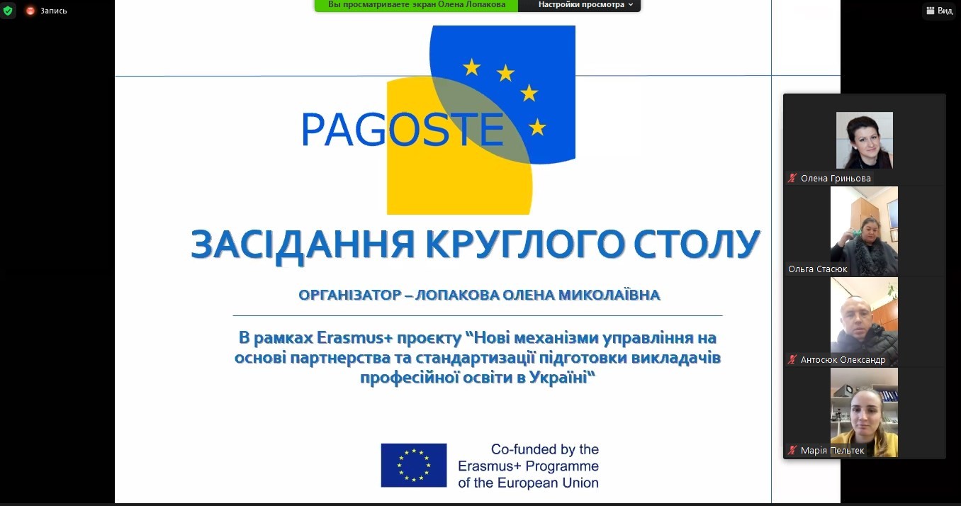 19 листопада 2020 року в рамках міжнародного проєкту Erasmus+ «Нові механізми управління на основі партнерства та стандартизації підготовки викладачів професійної освіти в Україні» (PAGOSTE, 609536-EPP-1-2019-1-DE-EPPKA2-CBHE- SP) проведено засідання Круглого столу. Організувала та провела захід методист Державного навчального закладу “Одеський професійний ліцей сфери послуг Південноукраїнського національного педагогічного університету імені К.Д.Ушинського” Лопакова Олена Миколаївна. Засідання відбулося в онлайн-форматі на платформі ZOOM. Зареєструвалися та були присутні на заході 23 педагогічних працівники, мова заходу - українська. Під час засідання круглого столу учасники переконалися у необхідності започаткування більш тісних зв’язків та співпраці між закладами вищої освіти та закладами професійно-технічної освіти. Учасники круглого столу сподіваються, що в ході реалізації даного проекту система підготовки викладачів професійної освіти зміниться на краще. А саме буде вироблений новий підхід до взаємодії між різними інституціями, що дозволить покращити якість підготовки та надасть можливість професійного розвитку викладачам закладів вищої і професійної (професійно-технічної)освіти.